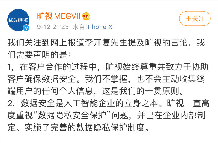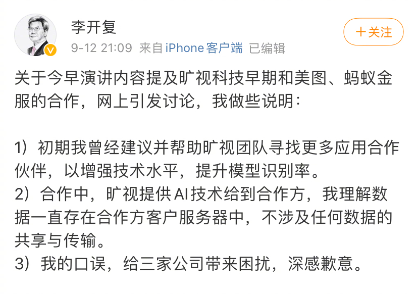 李开复也通过自己的微博发布声明,表示是自己口误,给三家公司带来困扰,深感歉意。称:“初期我曾经建议并帮助旷视团队寻找更多应用合作伙伴,以增强技术水平,提升模型识别率。合作中,旷视提供AI技术给到合作方,我理解数据一直存在合作方客户服务器中,不涉及任何数据的共享与传输”。