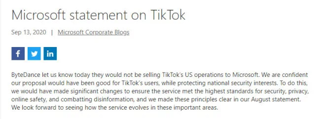 微软在声明中表示:“字节跳动今天告知我们,不会把TikTok在美国的业务卖给微软。我们相信自己的提议将有利于TikTok的用户,同时保护国家安全利益。要做到这一点,我们本应做出重大改变,以确保该服务符合最高标准的安全、隐私、在线安全和打击虚假信息,我们在8月份的声明中明确了这些原则。我们期待看到服务在这些重要领域的发展。”