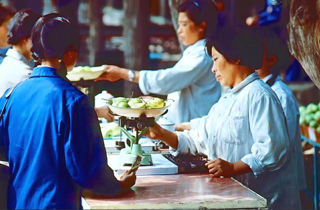 水果售货员与顾客。那时城市里的水果摊都是公有制的