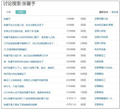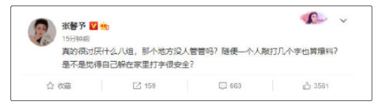 10月29日晚上,张馨予公开diss豆瓣知名八卦爆料小组:“真的很讨厌什么八组,那个地方没人管管吗?”不过没多久她就删除了这个帖子。
