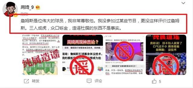 是因为造谣者别有用心的挑选了国内、外流量最顶级的两位球星,让周琦黑、詹姆斯黑找到了情绪宣泄的出口,并挑动了周琦球迷与詹姆斯球迷之间的矛盾,甚至有些不明真相的路人,也莫名其妙的在心里对周琦、詹姆斯败了好感,这用心,不可谓不险恶。