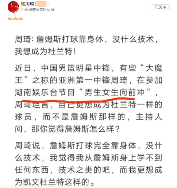 周琦在参加某节目时曾说,自己更想成为杜兰特那样的球员,詹姆斯打球纯靠身体,没有技术。