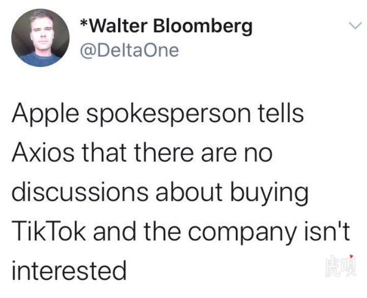@虎嗅【网传苹果对收购TikTok有极大兴趣,苹果否认】8月4日晚,知情人士透露称,除了微软,苹果公司也对收购短视频应用TikTok感兴趣。随后,苹果发言人辟谣称,苹果没有讨论过收购TikTok事宜,且苹果对收购TikTok也不感兴趣。但知情人士表示,多个消息来源告诉其苹果表达了兴趣,包括一名高级行政官员。