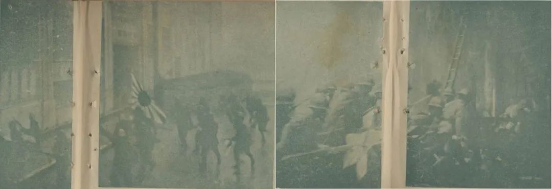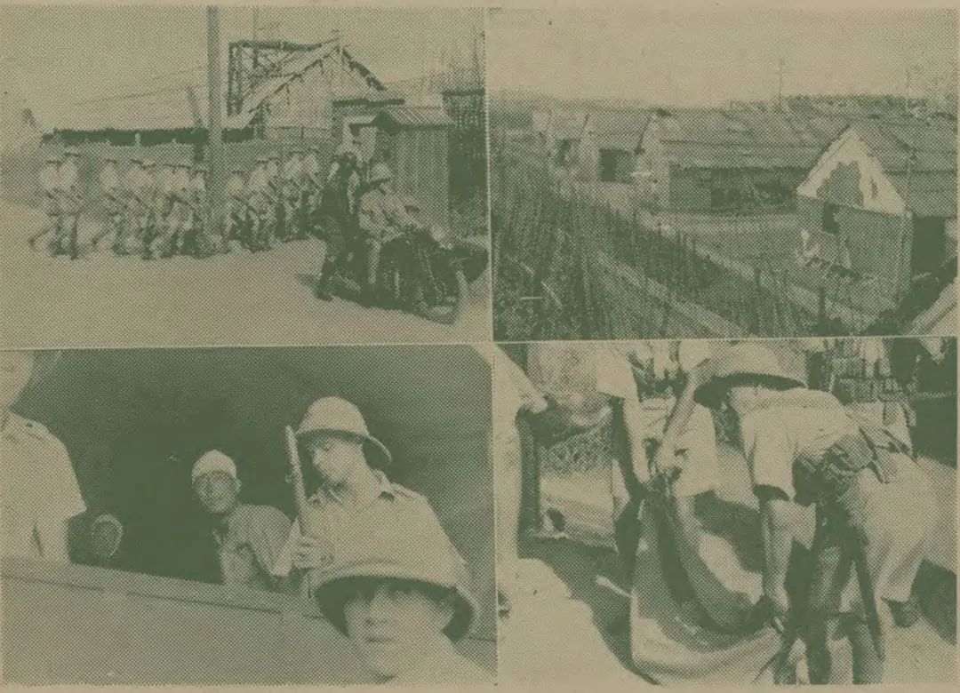 ▼自左至右、自上而下,依次是:(1)租界当局派军队进入孤军营;(2)外部远距离拍摄孤军营;(3)受伤孤军被租界当局用卡车送走;(4)租界当局处理被杀害的孤军士兵。