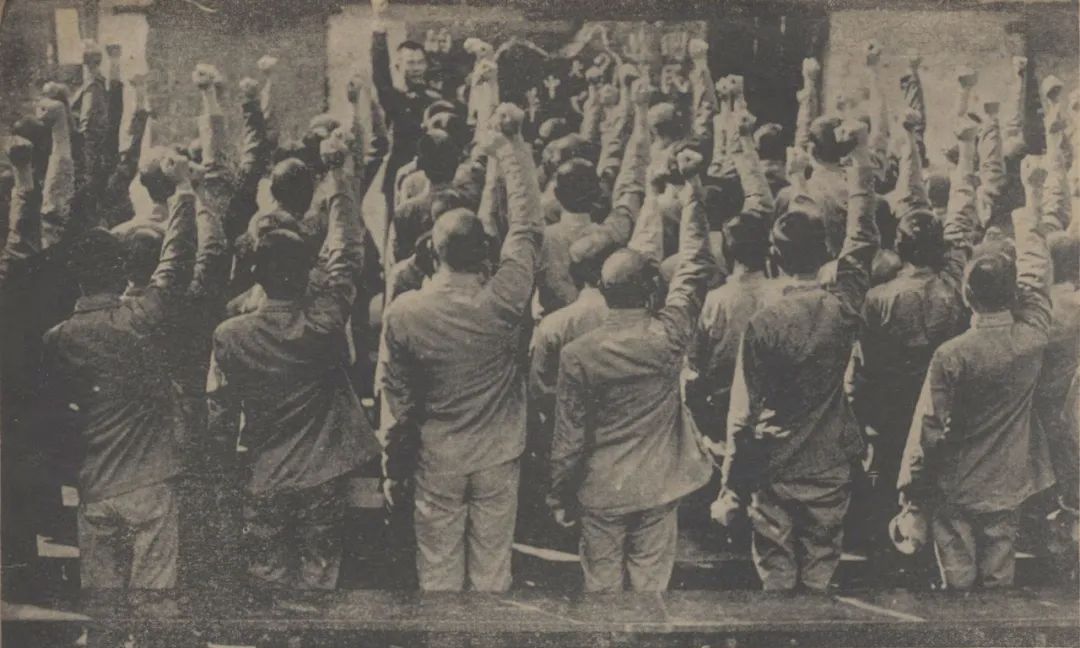 ▼因旗帜被租界当局搜缴,谢晋元只能率孤军营举行“精神升旗”