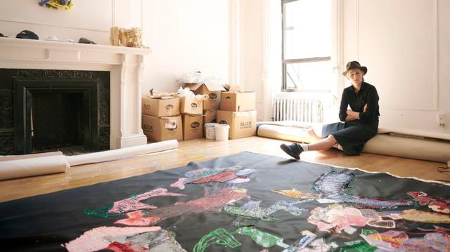 不久前的一个早晨,画家 Leelee Kimmel在其上东区的画室内边走边说,“我喜欢画交叉阴影线。”这画室由一套战前公寓改造而成,她大尺幅泼洒颜料的抽象画作与洁净的室内装修对比鲜明。“其实想想,我们处于时代交叉点的一代人”,她补充道。“因为我们总在往一切上贴标签,加#。”