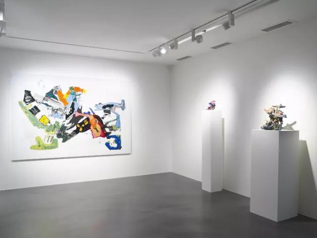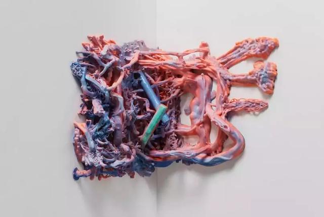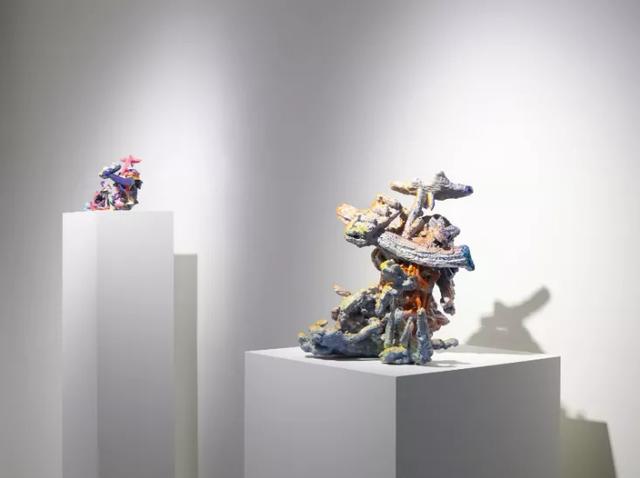 画作之外,Kimmel还展示了3D打印后经过修理和绘制而成的雕塑作品。这些生物形态从画作自然发展而来,仿佛从画布一跃而出进入画廊。它们鲜活生动,犹如会呼吸的有机体,又犹如在画廊时空中兀自存在的星球。而在相邻的画廊空间内,她继续着自己在虚构风景的旅程,以一件虚拟现实作品,带领我们迈上超凡振奋的五分钟航程,进入画作建构的世界。《虫洞》(2018)与艺术家的二维作品一样,漂浮着五颜六色的形状与形体,犹如广袤黑幕上浮动的众多星系。