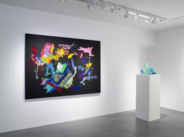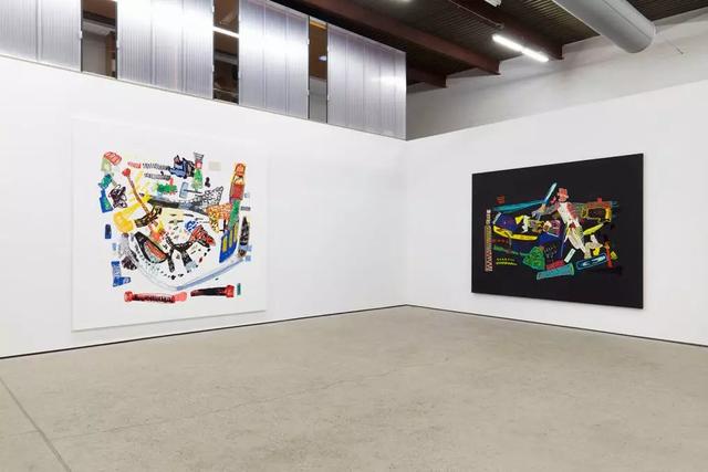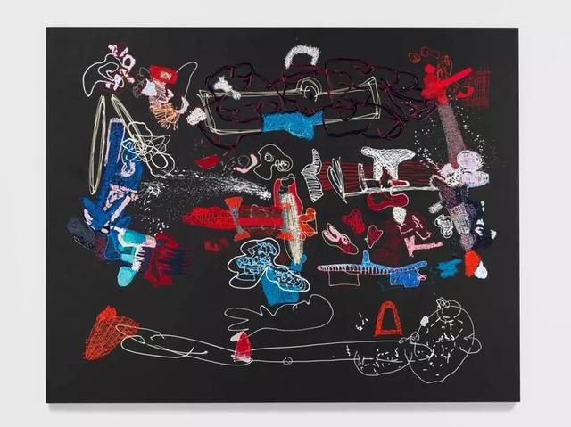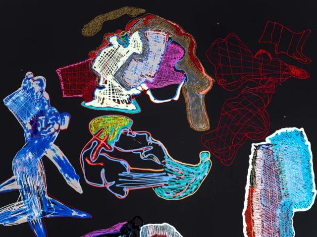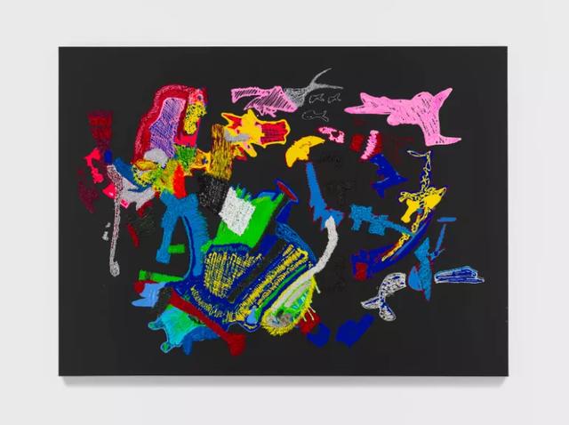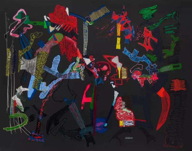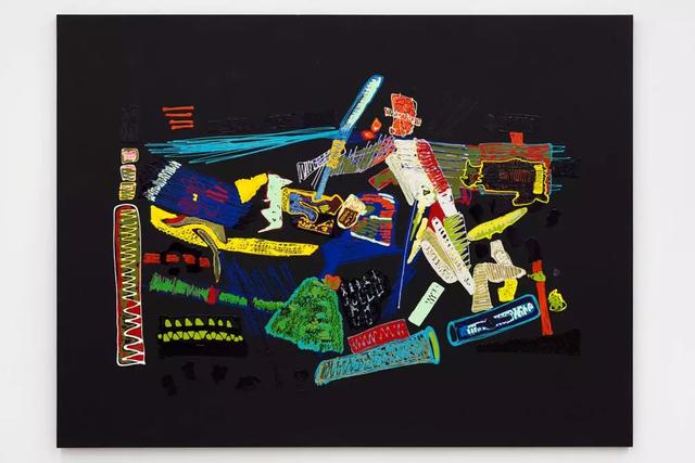 Leelee Kimmel画作尺幅宏大,纯白抑或纯黑的底色上横陈层叠厚实而明亮的丙烯酸颜料。作品能量十足,躁动不安,自由奔放,与画家的创作过程本身深深相联。构图在表现形式方面故意不断跳转,时而感性,时而严谨,时而亮滑,时而雾哑,交缠纠结,满满当当。复杂的图像色块由阴影线与对抗的矢量线、各种图案及突如其来的生物图像组成,似乎来自异世界。强劲而紧张的线条令人想到画家巴斯奎特(Basquiat)与托姆布雷(Twombly) ,而她所创造的神秘世界与梦幻氛围,又融合成一种异军突起的现实主义。