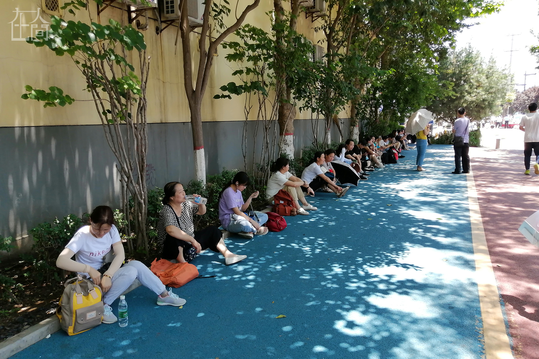 英语听力模拟考试当天,家长在校外的阴凉处等孩子,当天温度37度,考试全程4个小时。