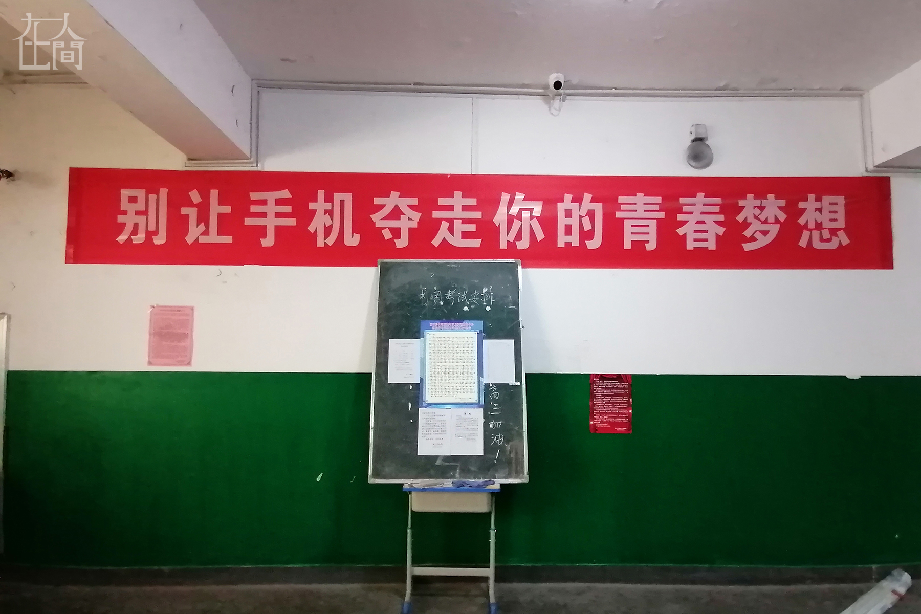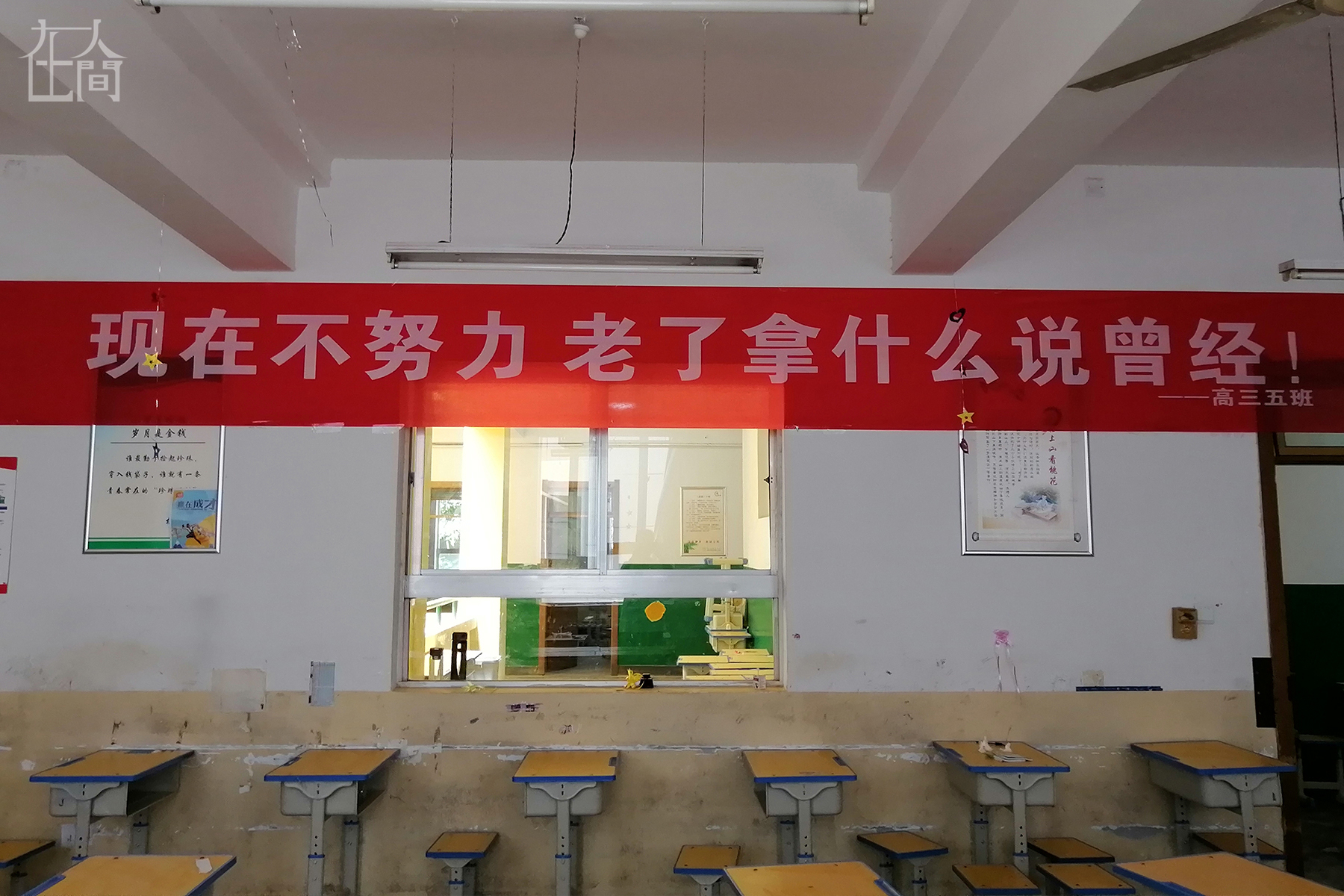 高三五班教室侧面挂着的宣传横幅,教室桌椅按照高考要求摆放得整整齐齐。