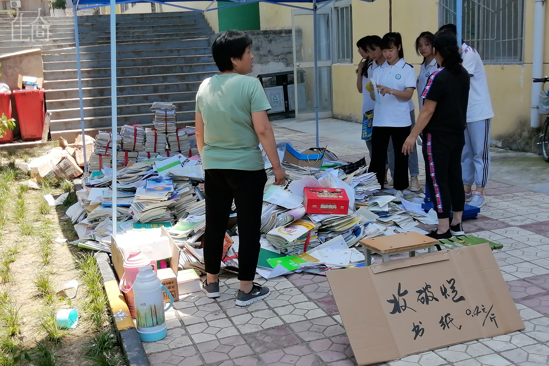 高三离校当天旧书回收现场,书纸0.4元每斤,高一高二学生在翻找和购买自己有用的旧书。