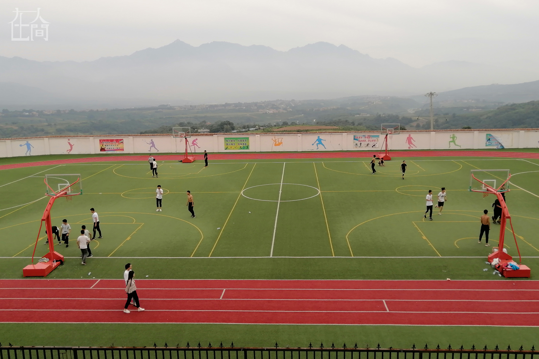 王龙初中的学校,他毕业后新修的操场,孩子们在操场锻炼,远处的秦岭若隐若现。