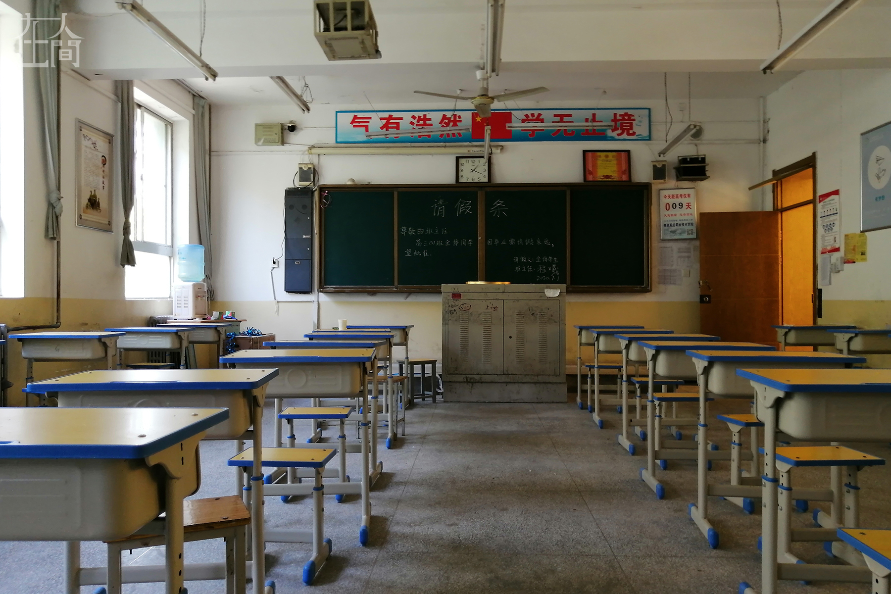 7月2号,高三学生离校后空荡荡的教室,黑板上是前一天晚上学生集体写给老师的请教条。