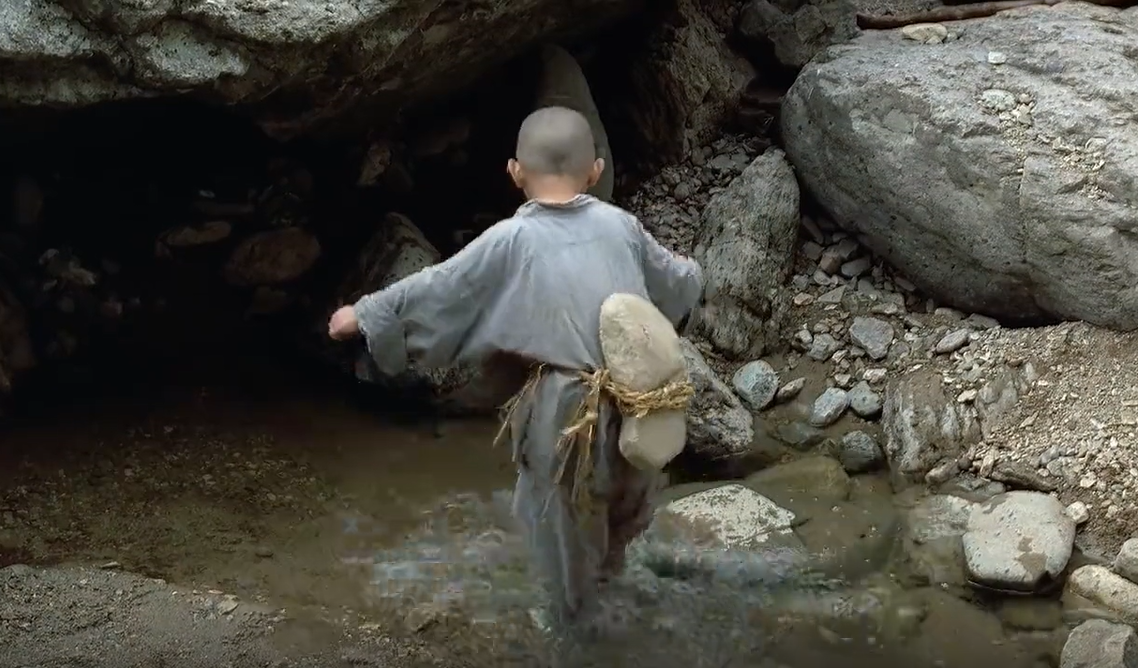 徒弟贪玩在小鱼、青蛙、蛇身上绑上石头,师傅发现后也将石头绑在徒弟身上。(电影《春夏秋冬又一春》剧照)