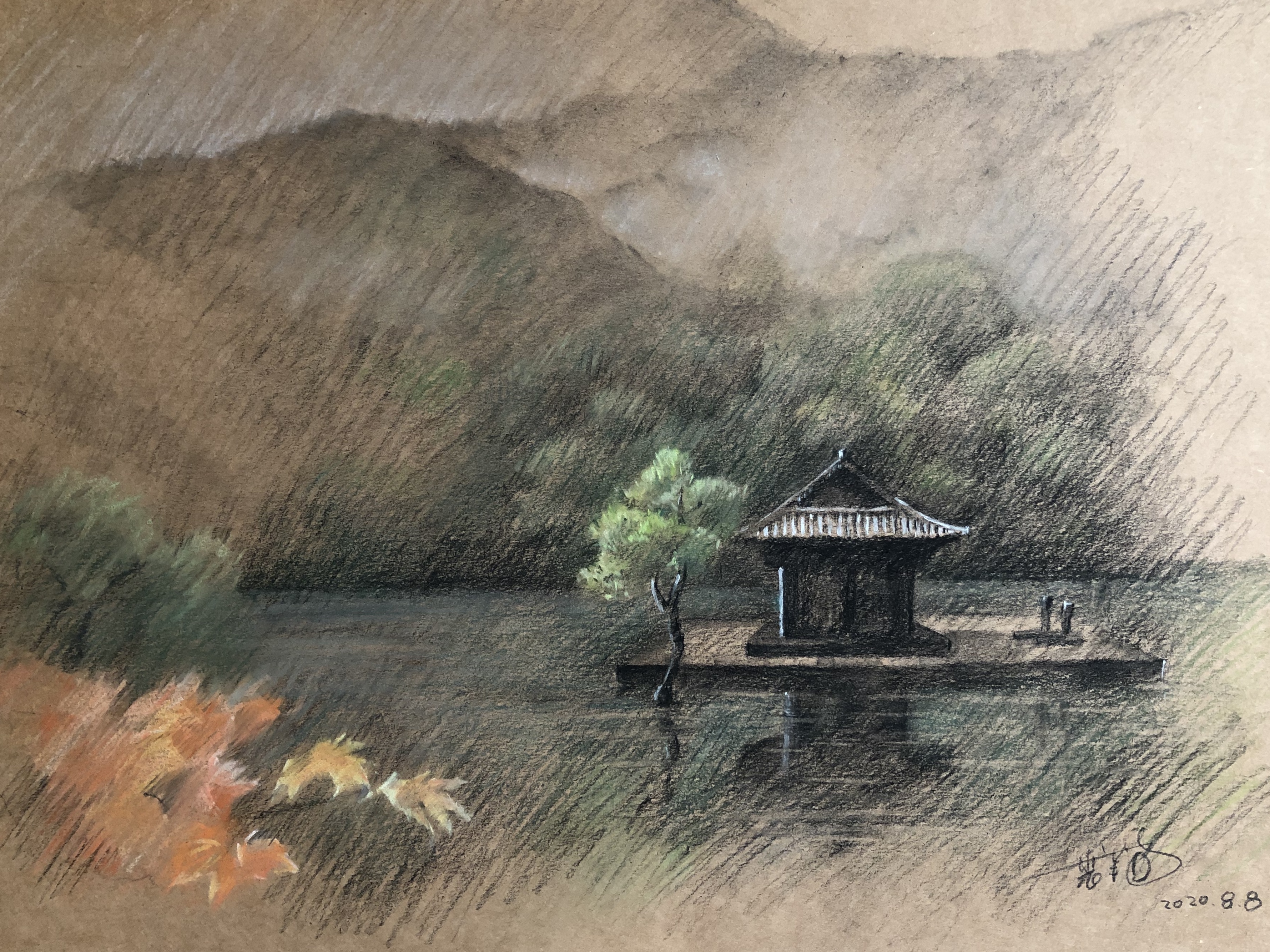 其间的空间类型也很丰富,有自然形式的,比如:围合之势的重峦叠嶂、浸泡山体的水没岸线;还有几何形式的,比如棱角分明的浮台以及那座既庄重又玲珑的歇山顶的庙堂;有动静结合的,比如摆渡的舟船和漂浮的庙庵;也有限定明确的以及边界模糊的,比如木构架的佛堂和佛堂内两侧的卧榻……丰富的空间类型意味着空间叙事语汇的多样性和趣味性,甚至动摇了观者沉浸其中的电影语境,令观者的审美格局趋于豁达,在传统的戏剧和工业化的电影范畴中摇摆、犹疑、浸没。