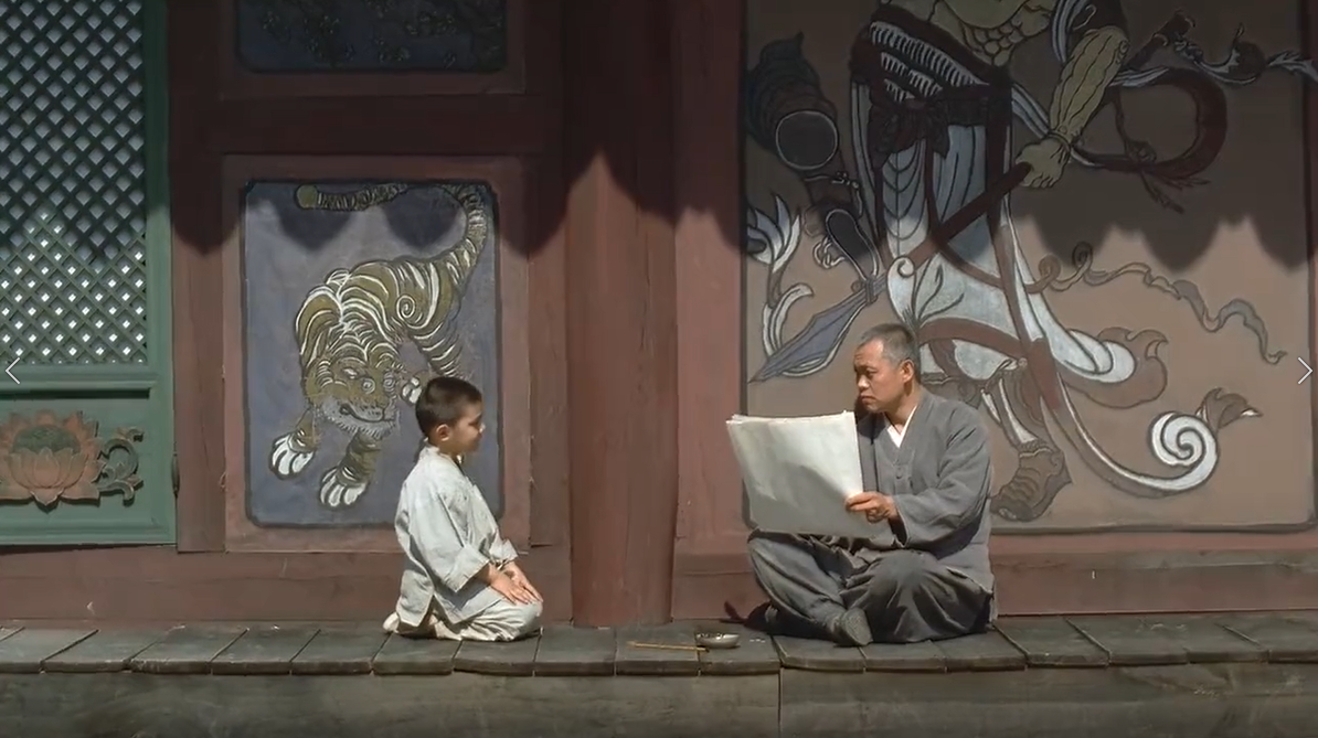 又一春中,曾经的徒弟变成师傅,收养了另一个徒弟,一切似乎又重头开始了。(电影《春夏秋冬又一春》剧照)