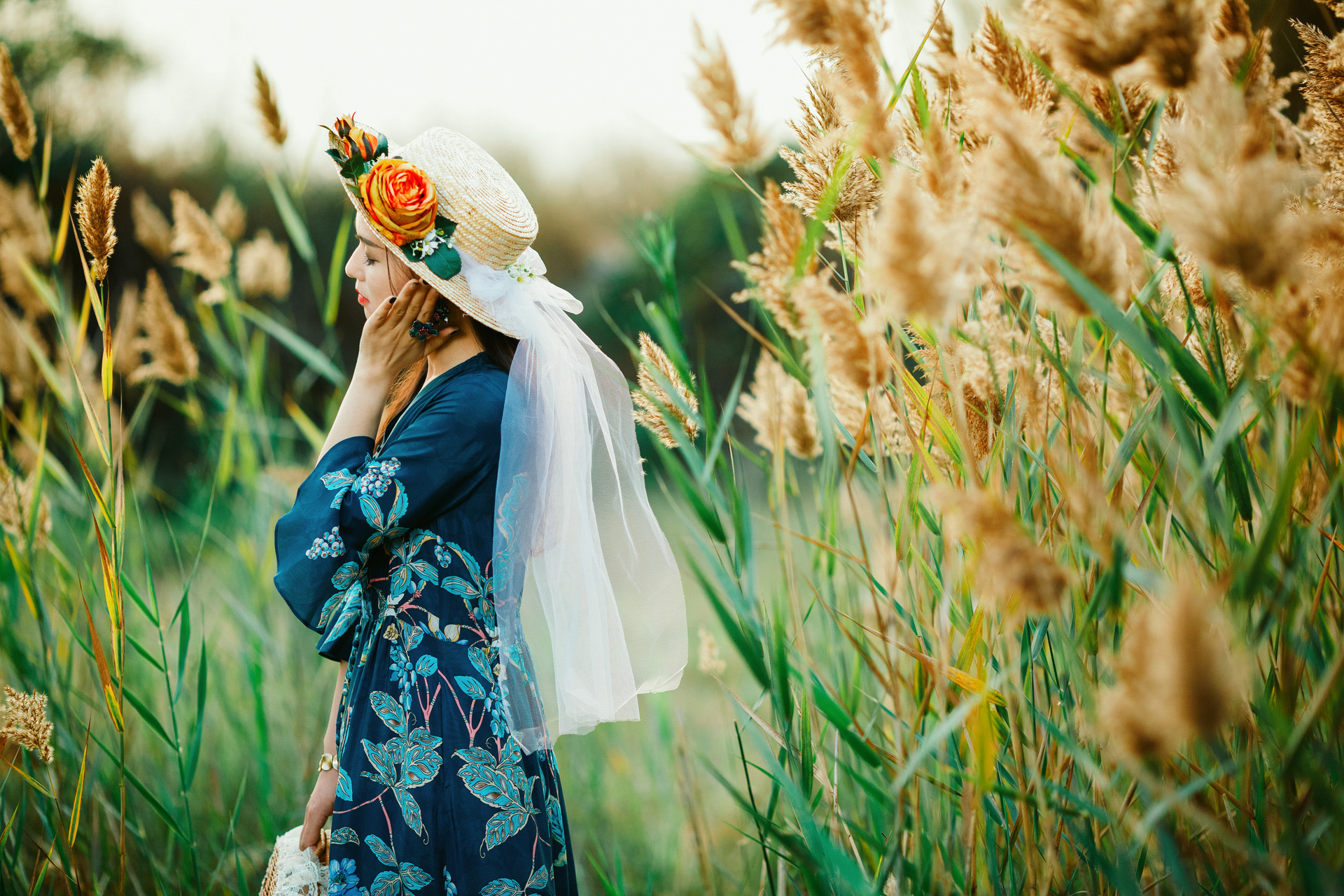 镜头是很多女生不太愿意直视的东西,如果人物不想面对镜头,可以尝试“偷拍”的方法来捕捉人物的情绪,像下面的女生一般,站在芦苇荡中,侧身对着镜头,闭上眼睛感受大自然的气息,这些小动作都是能很好地叙述故事。