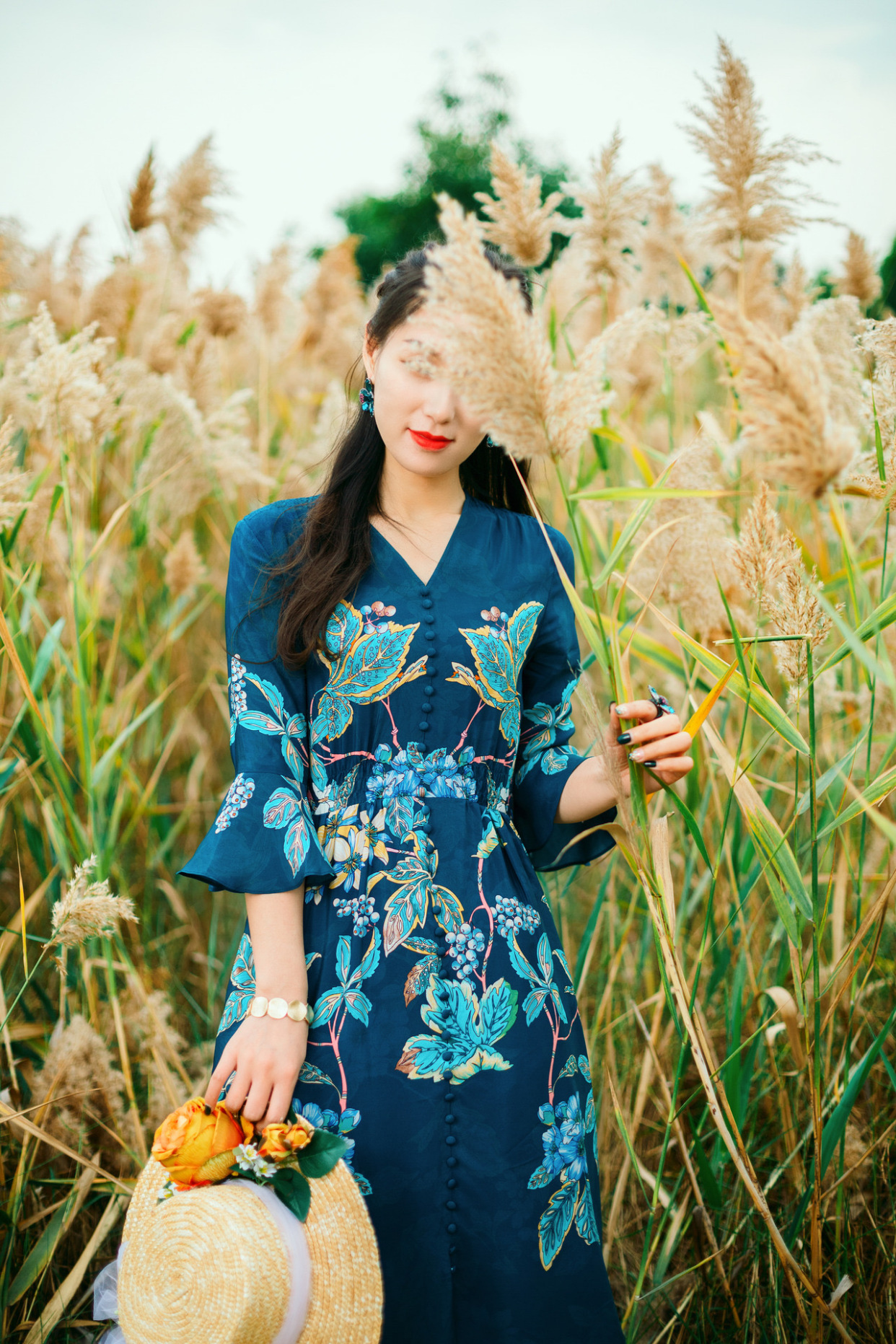 户外人像摄影,手的姿势也很重要,为了避免手空不好摆姿势的情况,可以拿束芦苇在手上,做一个和镜头互动的姿势,配合上侧身歪头的动作,一来能融入场景,二来姿势很自然好看,拍照美美的。