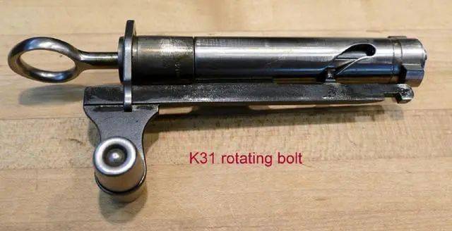 先说一下名字,K31全称是Karabiner 1931,那个K和KAR 98K的第一个K一个意思,就是卡宾枪的意思,瑞士也是一个德语国家嘛。这把枪全长1105mm,枪管605.2mm,空枪重量为4千克。使用的是瑞士人自己的7.5*55mm步枪弹,有效射程500米,最大射程5500米,话说,5500米的距离什么也看不到了。这把枪最大的亮点是其直拉式枪机,别的步枪都需要转动枪机,然后才能拉动枪栓,而K31则是直接拉住拉机柄,就可以直接向后拉动枪机了,完成抽壳抛壳的动作。你看这个枪机他是比较方便,看上去也比较高大上,其实呢,其本质上还是个转栓闭锁的枪机。其枪机上有一条倾斜的曲线槽,向后拉动拉机柄的时候,可以直接驱动枪机旋转开锁。但是这种直拉式枪机的好处在于,在拉动拉机柄时,射手动作幅度相对较小,完成抽壳抛壳动作的速度要更快,一定程度上提高了K31步枪的射速了。