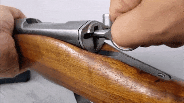 这种直拉式枪机也算是瑞士步枪的一个特色,他们从蒙德拉贡步枪那会儿开始,就一直在玩直拉式枪机了,到后来,鲁宾系的那一票步枪都是直拉式枪机。这把枪的拉机柄是那一个T型的手柄,并不是那个圆环,很多人会误认为是那根圆环。其圆环作用主要是作为保险使用,拉起旋转之后可卡死击针。同时,也可用于排除臭弹之用。