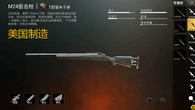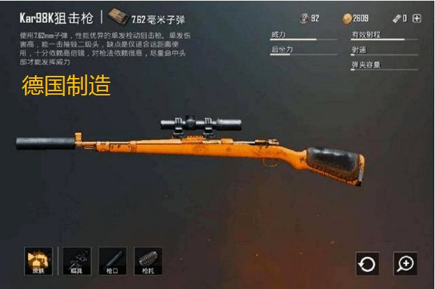 Kar98K狙击枪,这是有德国制造的一把枪,起初在二战战场中是纳粹军的制式步枪。由于当时的条件落后,加上这把枪械设计的出色,一度被用来当做精度狙击枪使用。虽然这把枪放在现在有些落后,但其出色的历史战绩和性能也是占据着狙击枪大佬的位置。特别是在游戏中,98K可以说是很多狙击手的启蒙老师。