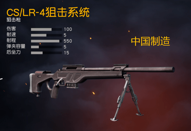 说完了其他国家的狙击枪,接下来就是我们中国的狙击枪大佬了。中国的枪械制造业相对比较落后,但是发展速度确实不容小觑的。在荒野行动中有一把名为CS/lr-4狙击系统的枪械是中国制造的最新产物。千万不要小瞧了这把枪。一枪爆掉三级头,普通场景可以拾取,在荒野行动中的CS狙受欢迎的程度是完全碾压AWM的。这把枪现实售价高达26W,也是中国枪械制造业发展的一个见证。