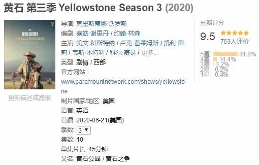 在豆瓣平台,《黄石》第三季拿下了9.5的高分,三星评价以上占99%,五星好评超81%。