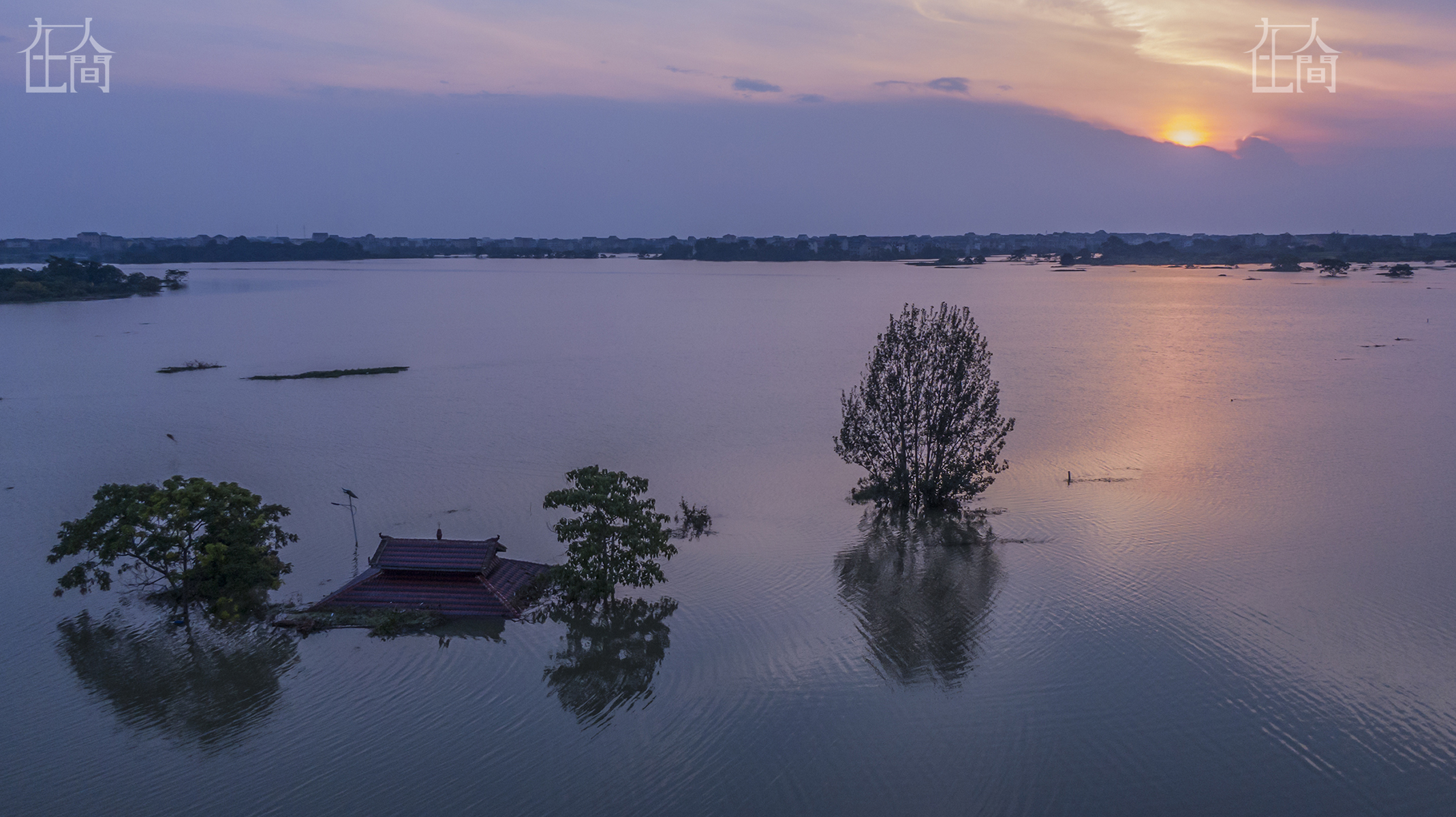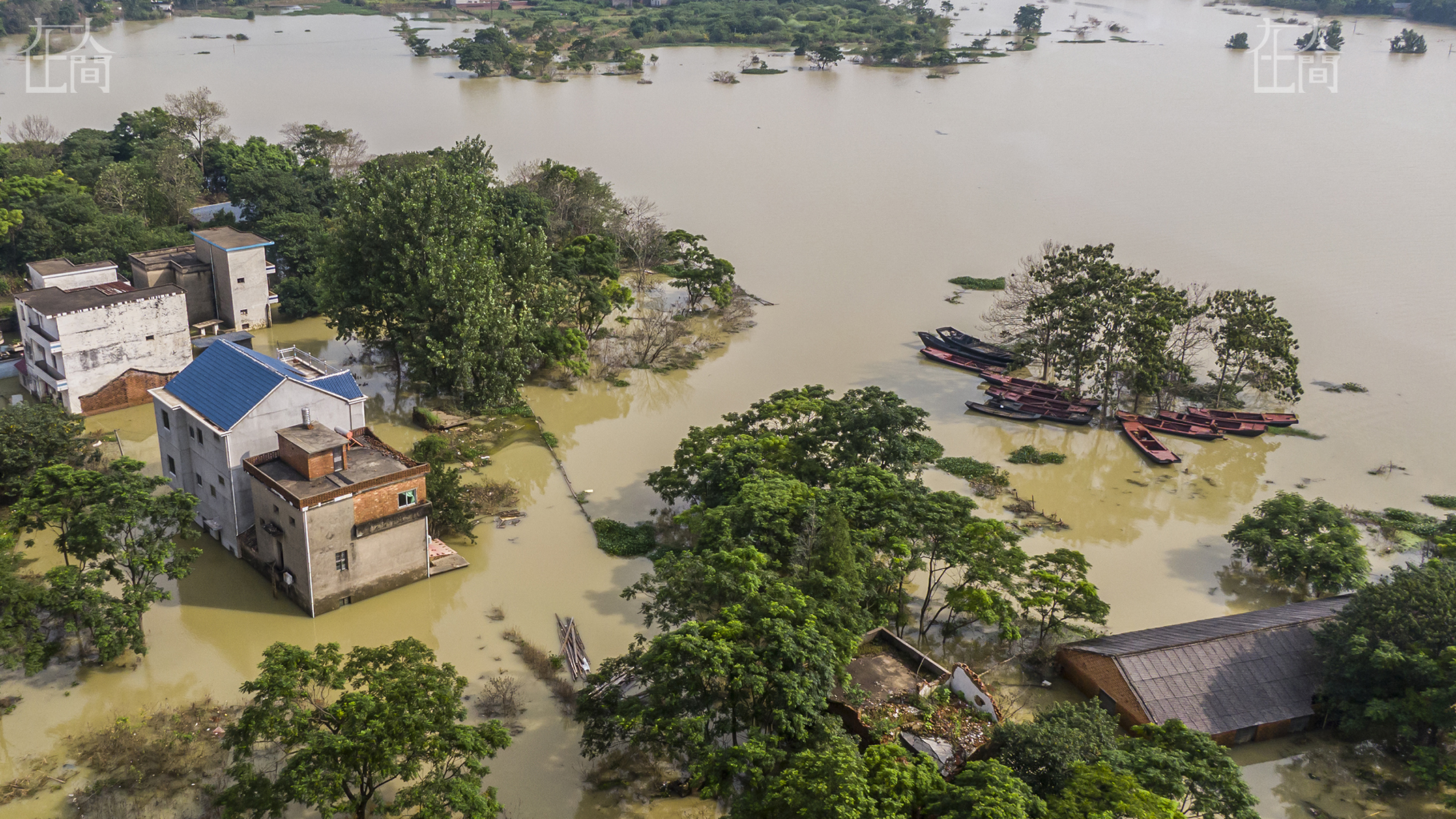 蓝色房顶处相连的三座房子为邵仁妹三代的家,均被洪水包围。分别是大儿子去年建好入住的新房,中间几乎完全淹掉的老瓦房以及1997年建成的老房子,目前是小儿子的住所。