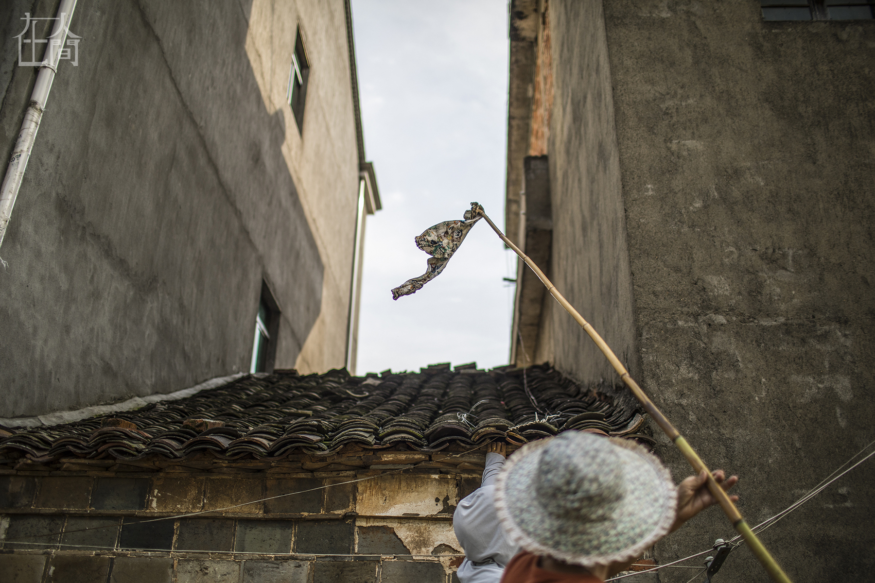 邵仁妹用竹竿捡起被吹落在自己瓦房顶上的孙子的衣服。