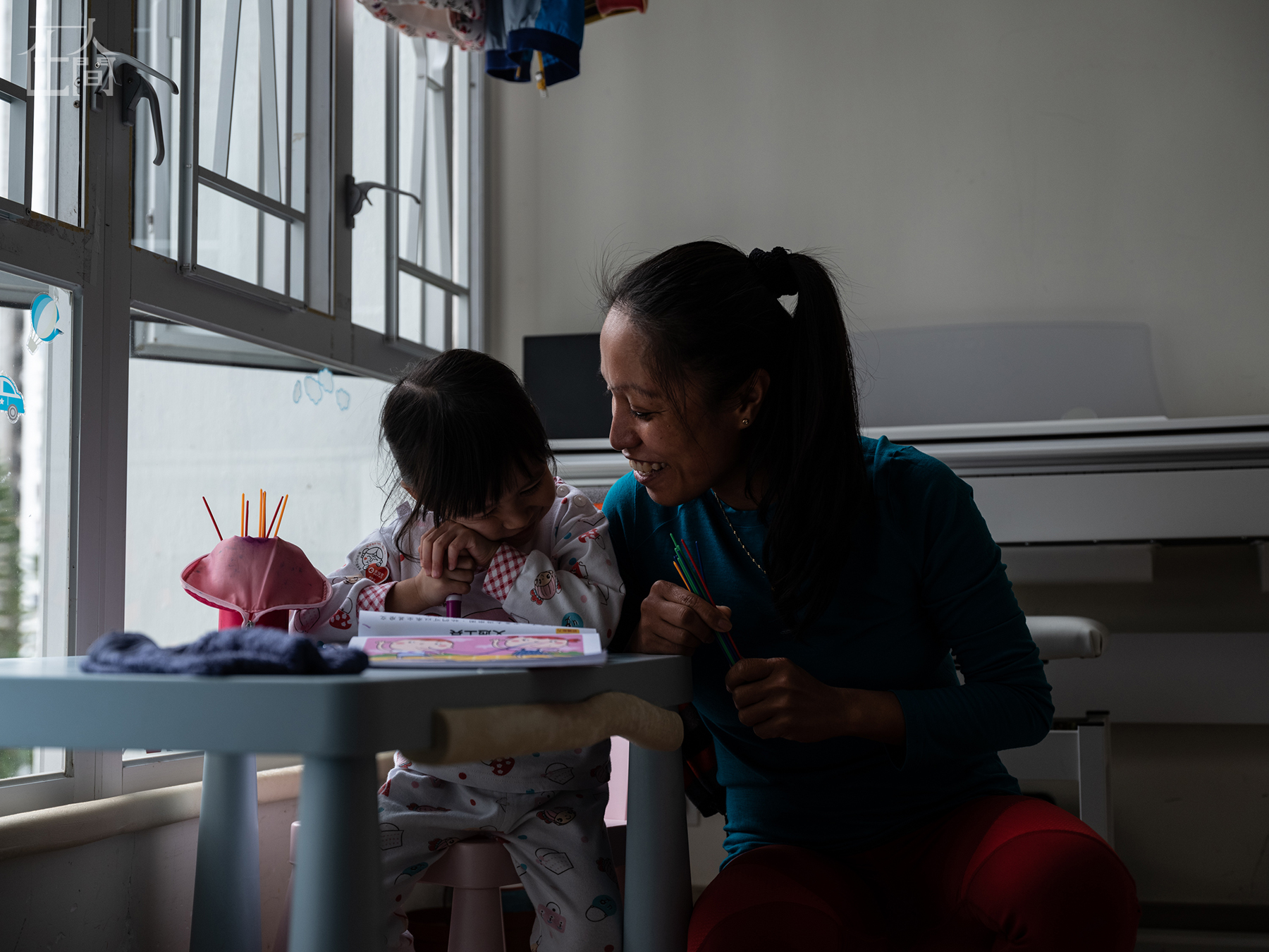 杰比·帕加里甘(Jaybie Pagarigan),今年39岁,2015年来到香港做家政工,现已经连续照料这个家庭近4年时间。杰比每周工作六天,和许多菲佣一样,在工作日,杰比为雇主照顾孩子、做饭、打扫和购物。而每周日是她的休息日,那天她会去参加越野跑。对杰比而言,跑步不仅仅是项运动,也是在日常环境中寻找被平等对待的机会。图为2019年3月16日,香港鲗鱼涌,杰比在雇主家中陪伴3岁的海瑟,从海瑟出生起杰比就是她的保姆。