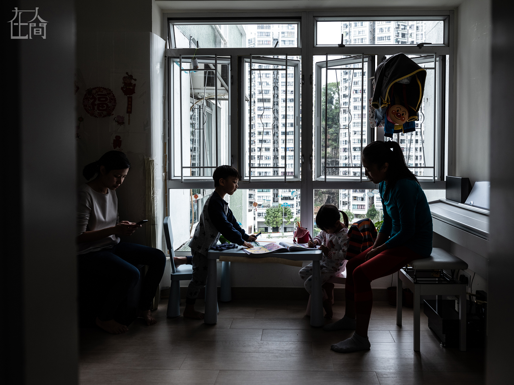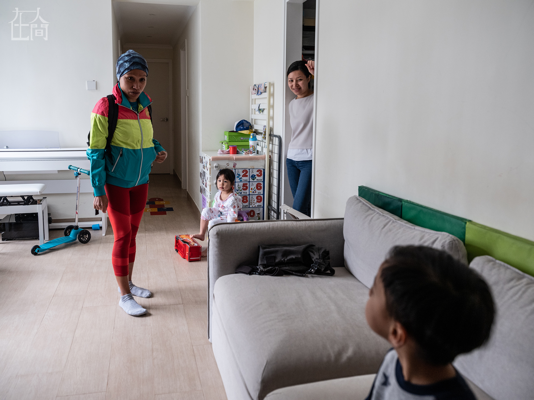 杰比来香港的原因很简单,为了更高的工资——根据香港劳工法例规定,杰比每月能拿到至少4250港币的工资,现在她的月薪是4500港币。图为雇主弗洛伦斯看着手机,她的两个孩子在房间里面和杰比玩耍。