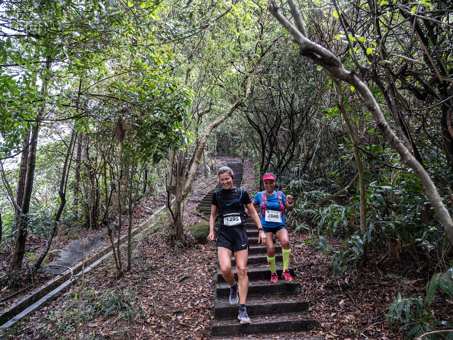那天,杰比用将近三小时的时间完成了比赛,对此她并不满意。早晨的暴风雨使得道路泥泞湿滑,她跌倒了两次。图为杰比和另一位跑者Sabine在香港“山野之王”马拉松的下山路段。