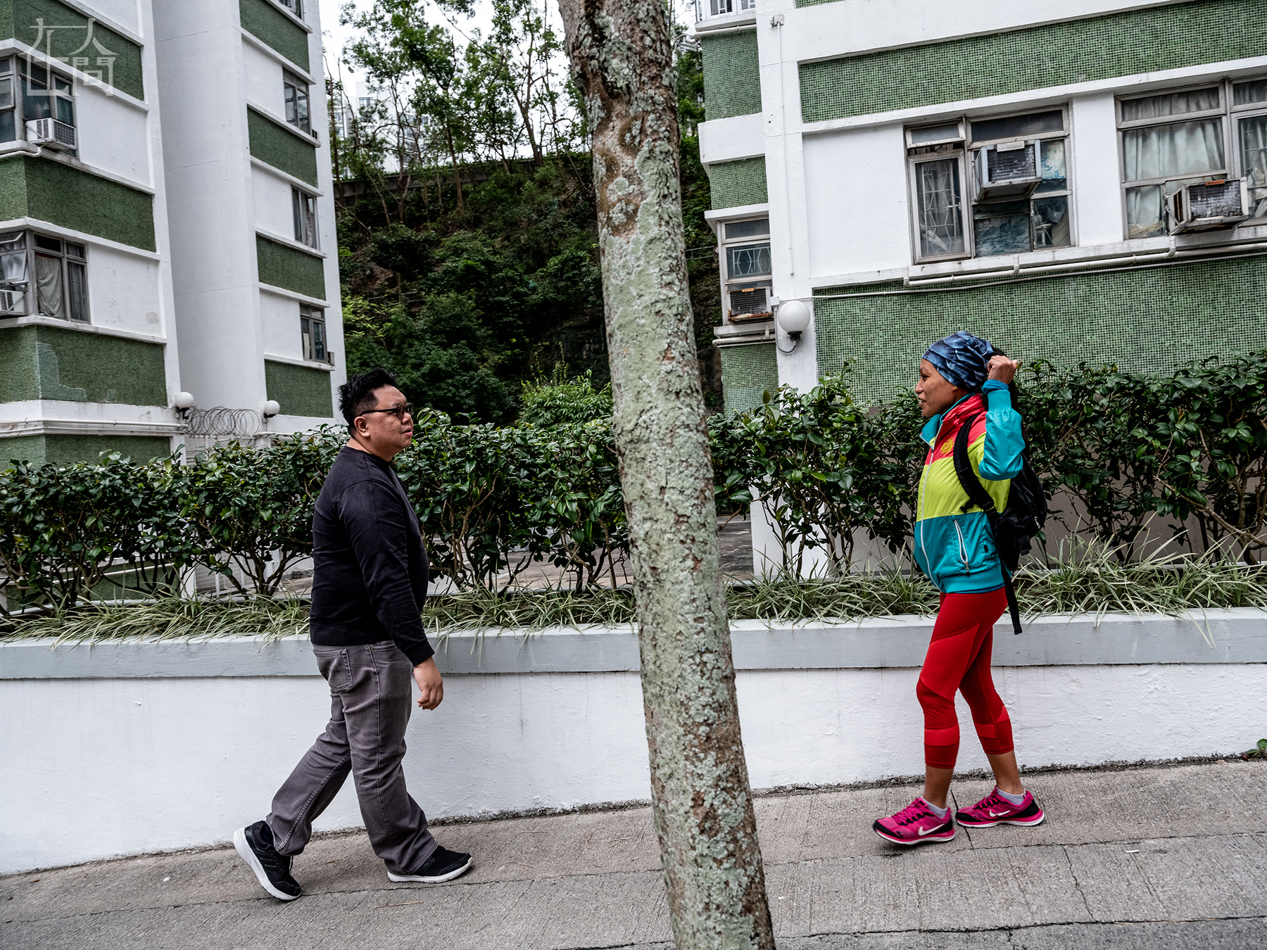 杰比介绍说,自己得到了雇主很大的支持,“像我这样晚上或白天工作间隙出去锻炼,对很多菲佣来说都是无法想象的”。 杰比和雇主关系很好,“我觉得他们并不把我当作佣人来看待”。但这样的关系也不是一两天就建立起来的。最初,杰比的雇主家和很多有外佣的雇主家一样——家里装满了摄像头,但是慢慢地“我们的关系在变化,我不再是,或者不再仅仅是他家的佣人,我们有很好的沟通和信任”。图为杰比在去购物途中遇到雇主。