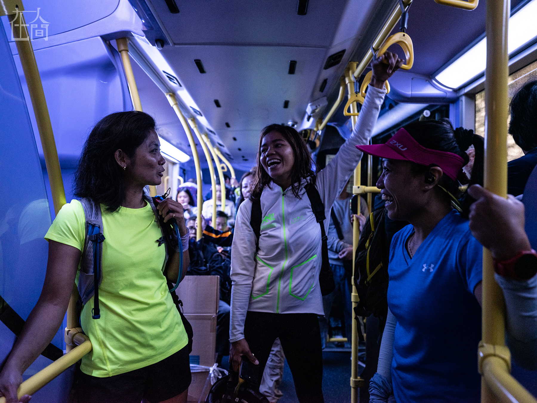 除杰比外,还有很多外佣参与到越野跑中,让·曼古巴特、弗雷德林·阿尔贝托和杰比一样,她们把跑步作为自己休息日的活动。每周日,她们都会聚集在一起去为即将到来的比赛训练。比赛的报名费并不便宜,为了能够参加,他们会加入比赛委员会,为下一场比赛争取一个免费名额。图为(从左到右)来自菲律宾的家政工让·曼古巴特、弗雷德林·阿尔贝托和杰比乘坐巴士。