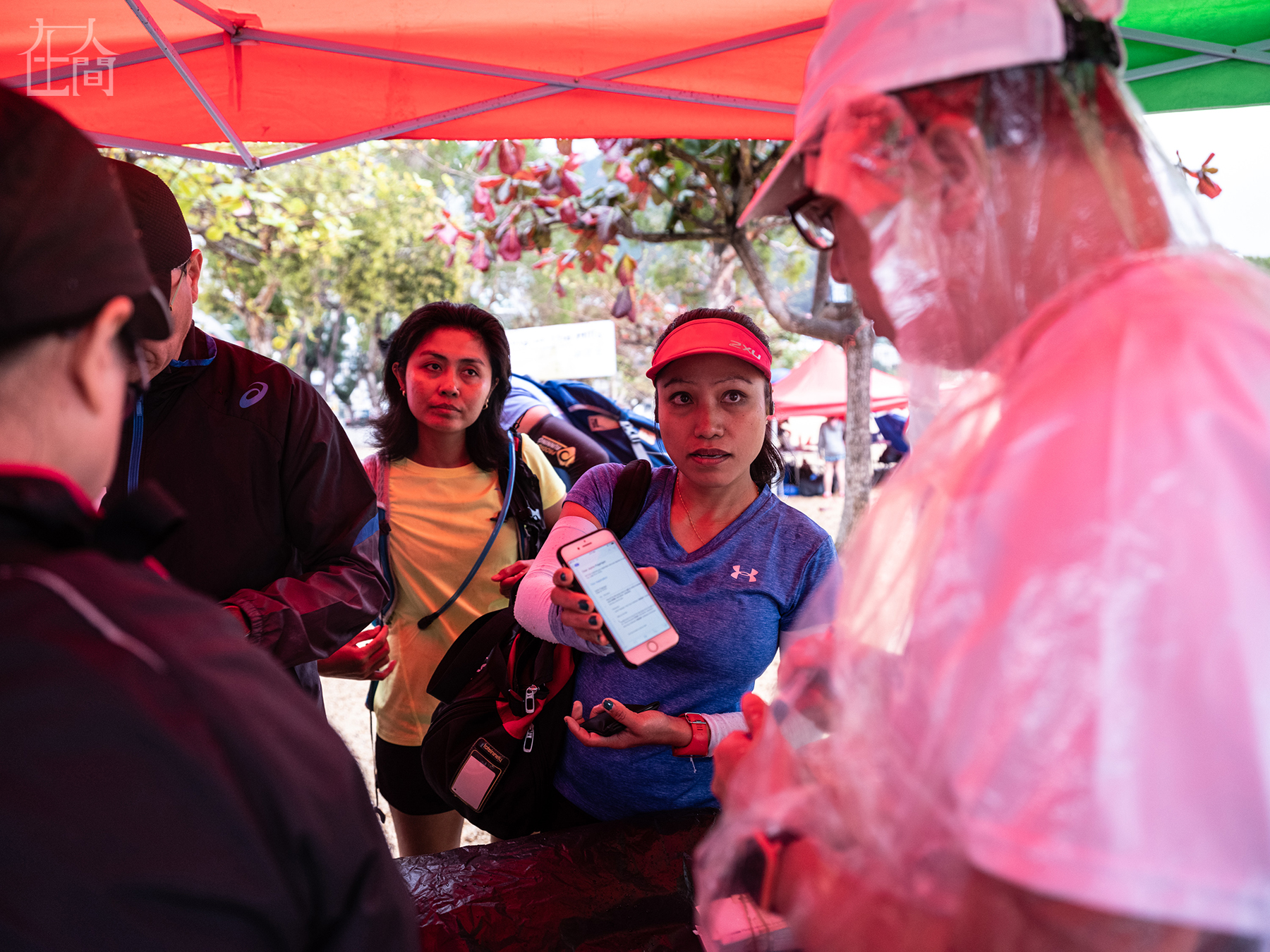 杰比记得很清楚,自己2015年1月12号来到香港。第一个周末休假的时候,杰比被推荐去了香港中环——香港外佣周末的聚集地。她和其他家政工人一起坐街边聊天、吃东西、打牌等等,但初来的杰比敏锐地觉察到有人在用一种怜悯的目光看着她。杰比说这让她感到很不舒服,心里有一种压抑和渺小的感觉。她告诉她的雇主,她不想再去中环“度假”了,于是雇主介绍她去香港周围的跑步道。图为杰比正向工作人员展示她参加香港浅水湾“山野之王”越野赛的报名信息。