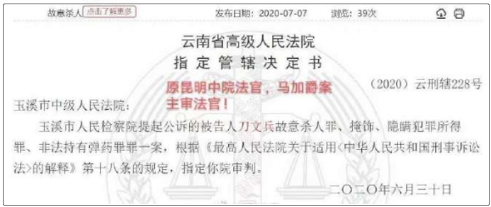 中国裁判文书网上的一份“指定管辖决定书”显示,6月30日,刀文兵因犯故意杀人罪、掩饰、隐瞒犯罪所得罪、非法持有弹药罪,被指定在玉溪市中级人民法院受审。
