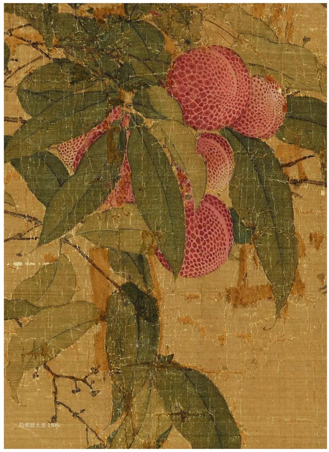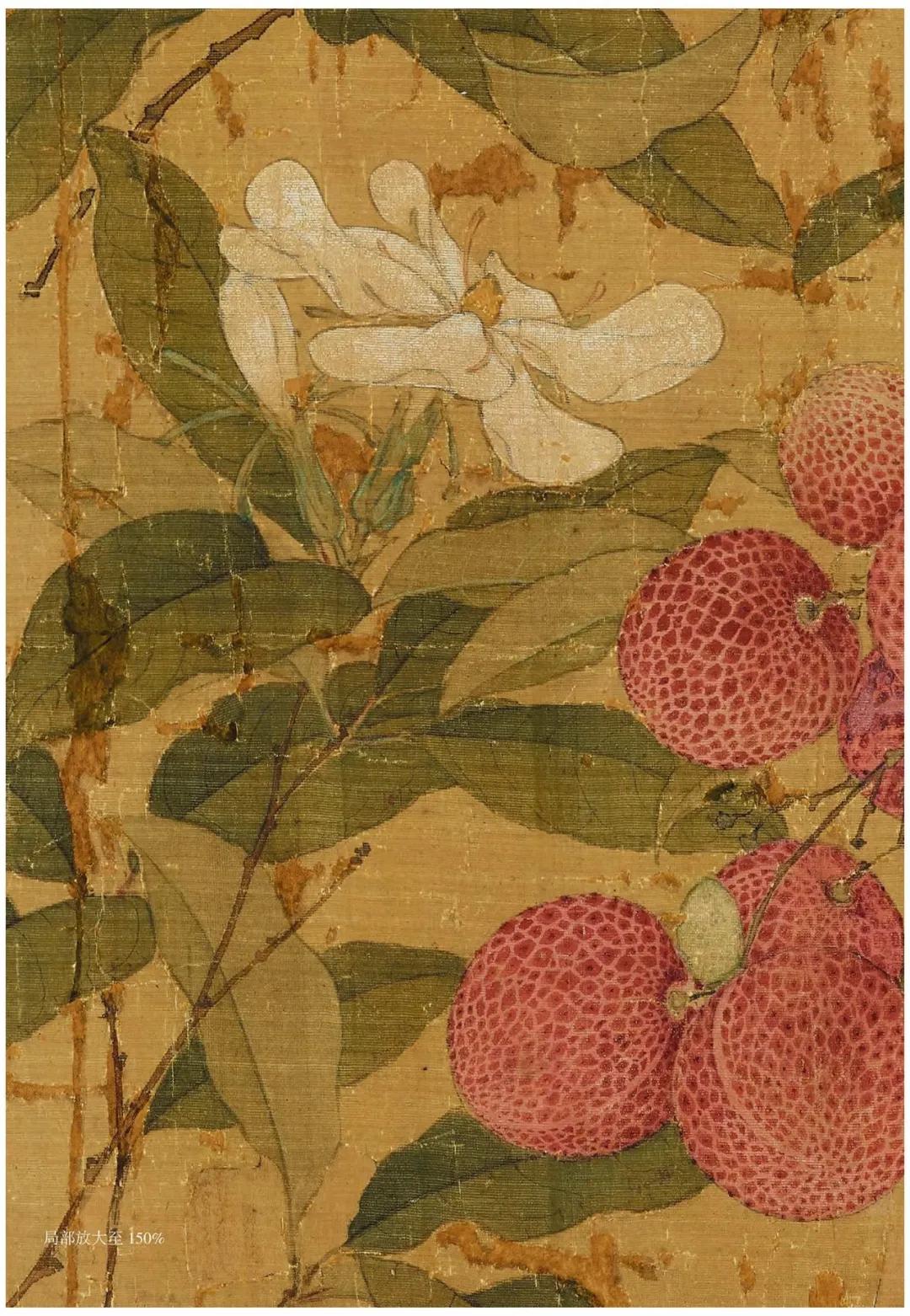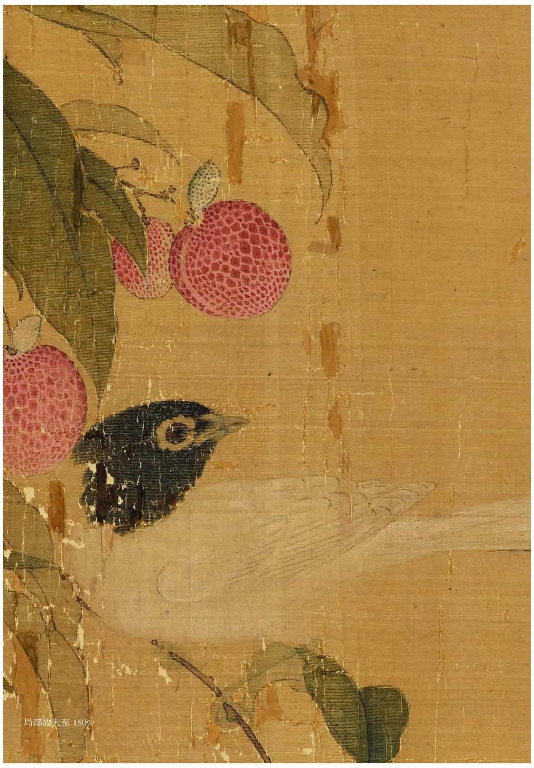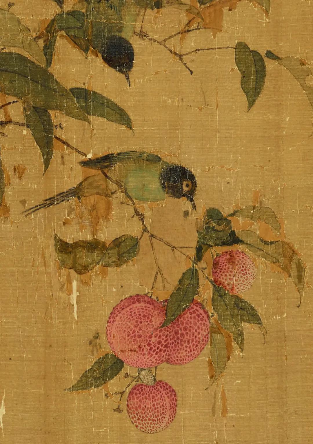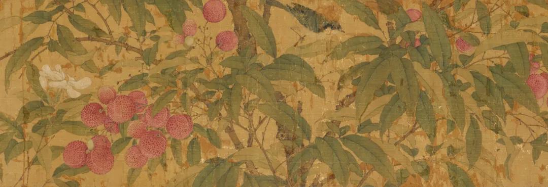 除禽鸟外,画面中大部分被簇簇丛生的荔枝所包围,徽宗对于荔枝这一物象的喜爱之情从他众多描绘荔枝的画卷中可以窥见。他曾为荔枝作下一诗: