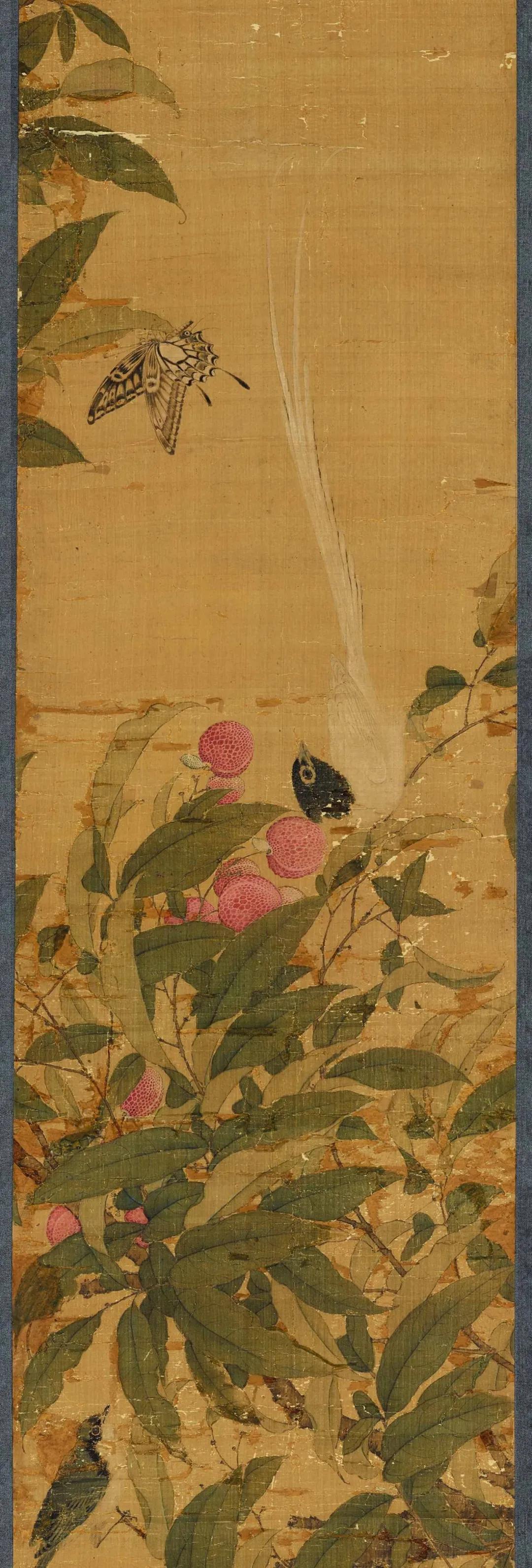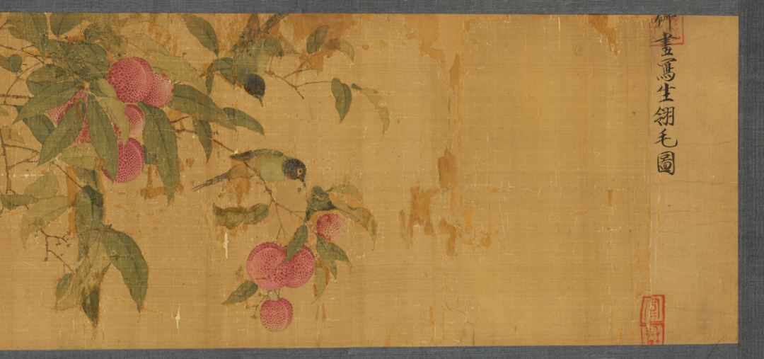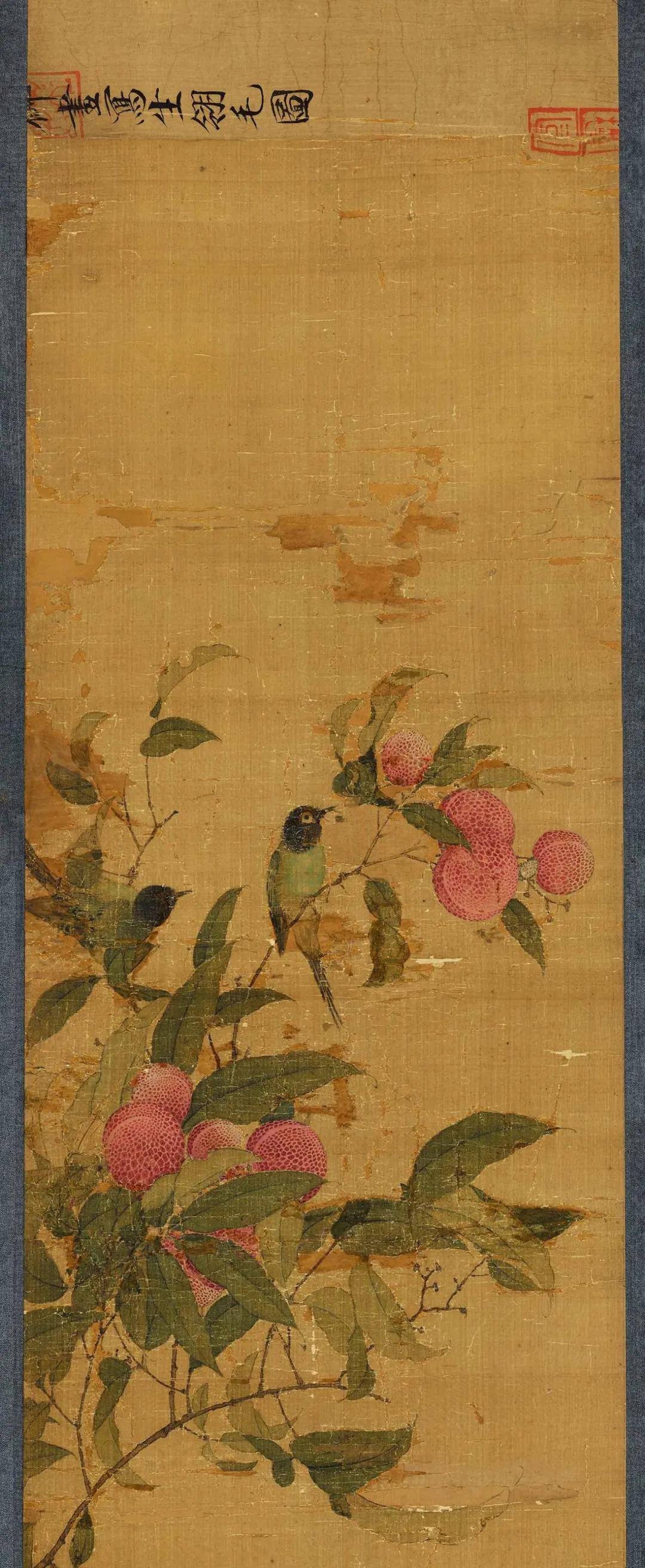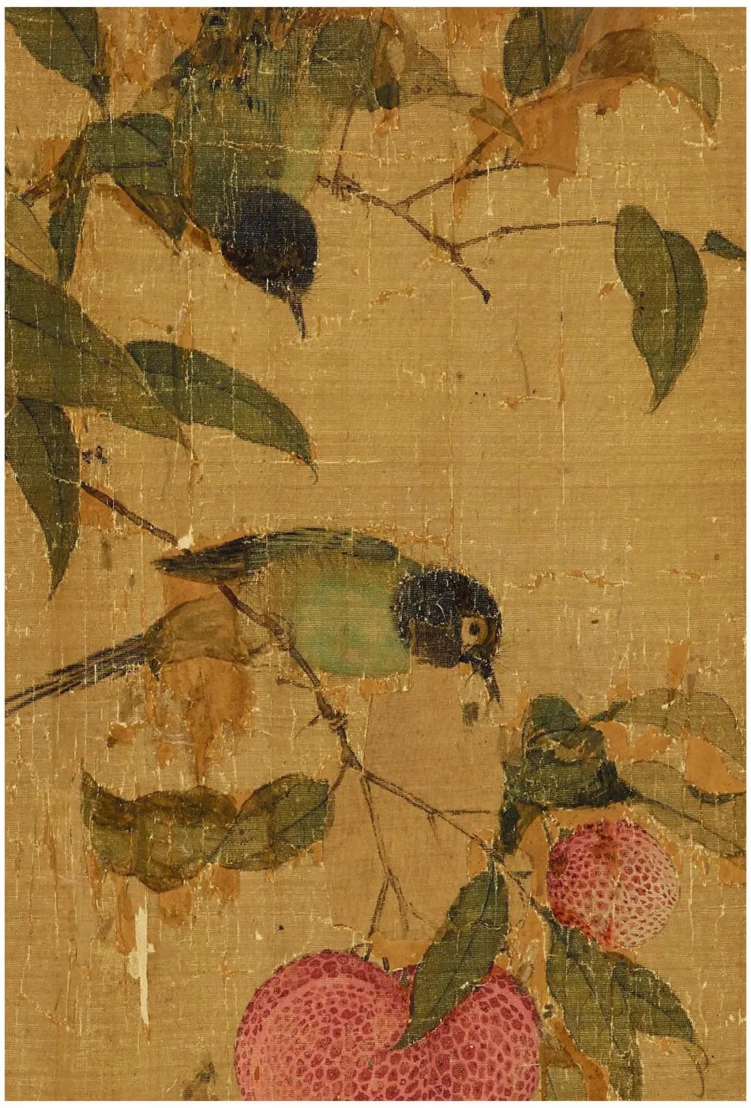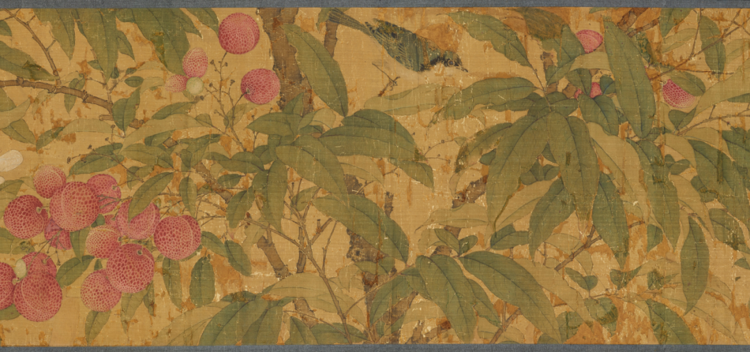 除禽鸟外,画面中大部分被簇簇丛生的荔枝所包围,徽宗对于荔枝这一物象的喜爱之情从他众多描绘荔枝的画卷中可以窥见。他曾为荔枝作下一诗: