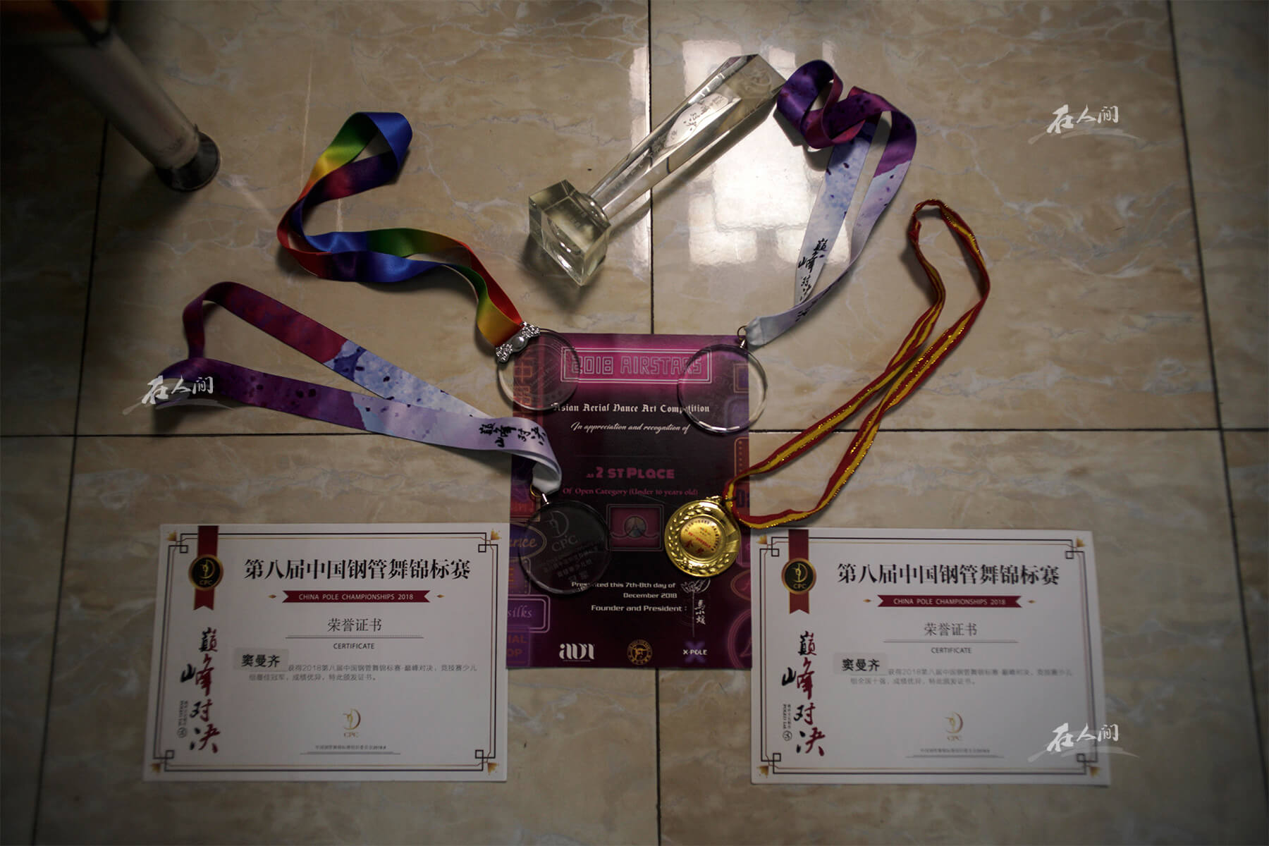 济南艺术学校,曼齐在钢管舞台。 “有天分,进步快”,是窦琼那时听到的对女儿最多的评价,但她也无法确定,这股天分的能量究竟有多大?直至2017年的6月30日,窦曼齐参加了天津市举办的钢管舞比赛,学了不到半年钢管舞的她,竟获得了少儿组的冠军。