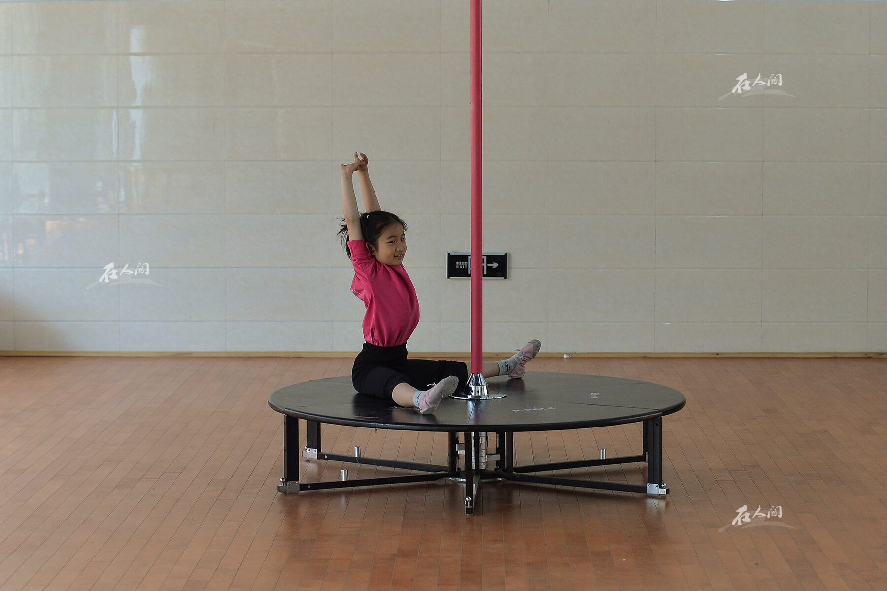 济南艺术学校,在做准备动作的曼齐。在钢管舞训练班里,窦曼齐是最小的学员。这里没有直接针对少儿的课程,教练就删减掉舞蹈中的“性感动作”,让她跟着大人一起上课。很多高难度动作,窦曼齐做得比成年人还好。