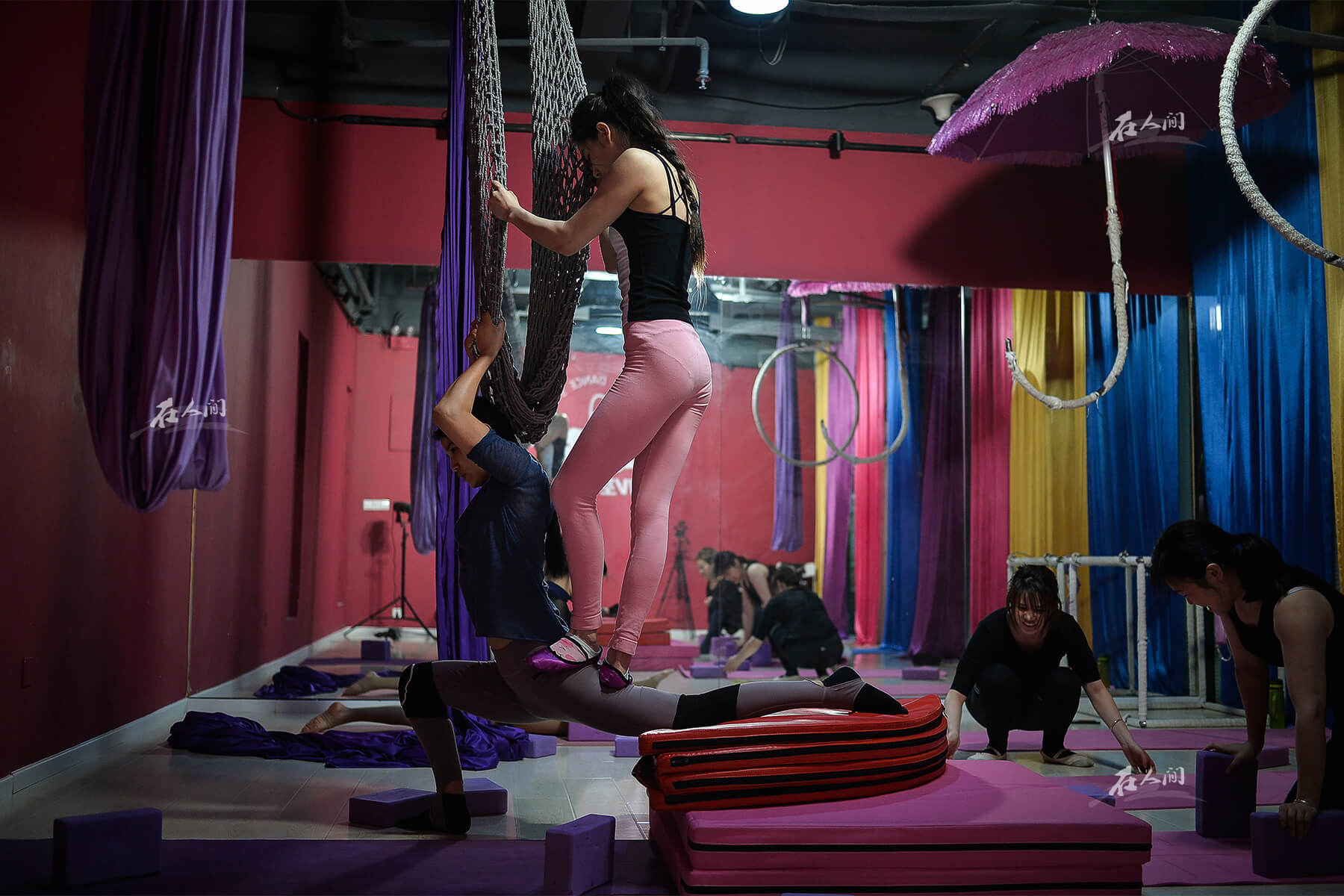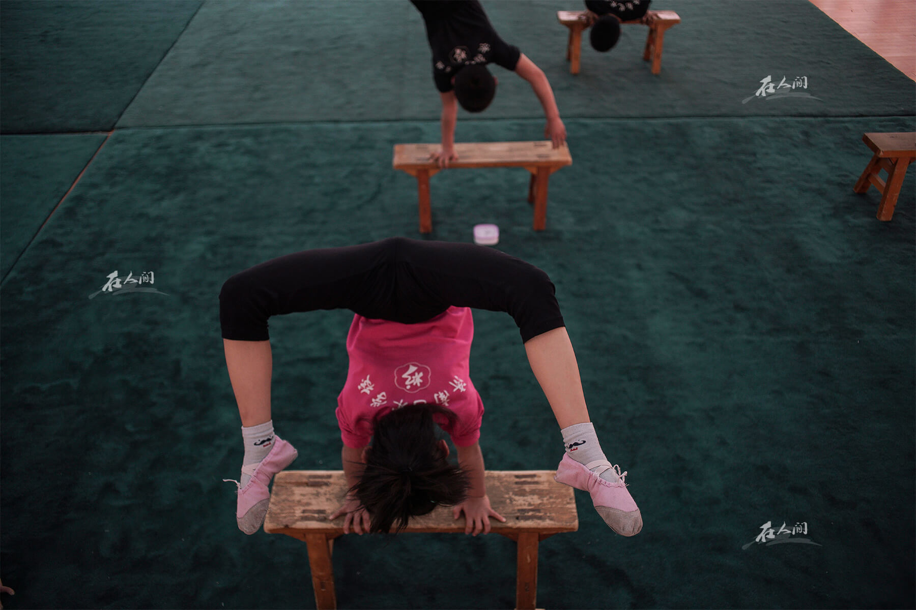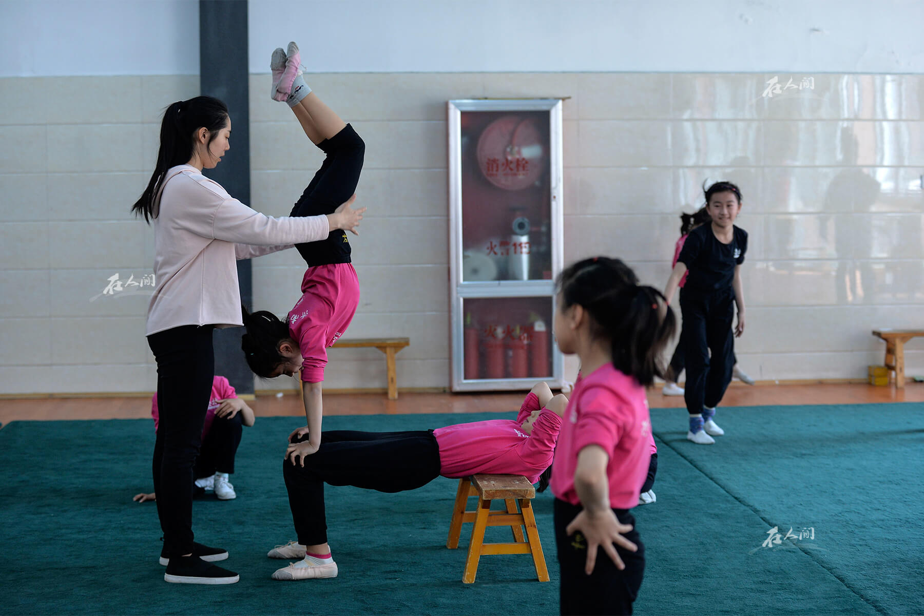 曼齐在进行杂技基本功训练。窦曼齐也跟母亲抱怨过:“妈妈,我想学的是钢管舞,为什么要学杂技呢?”