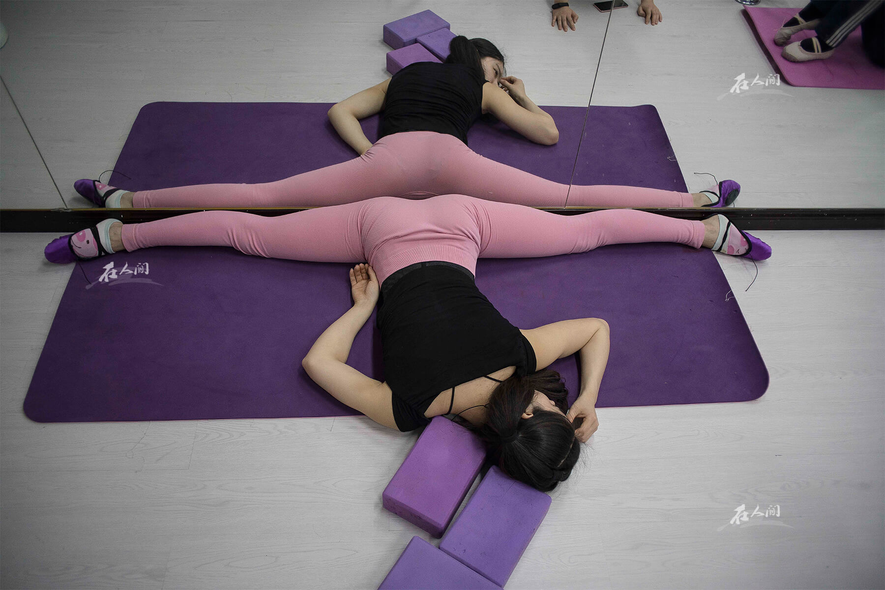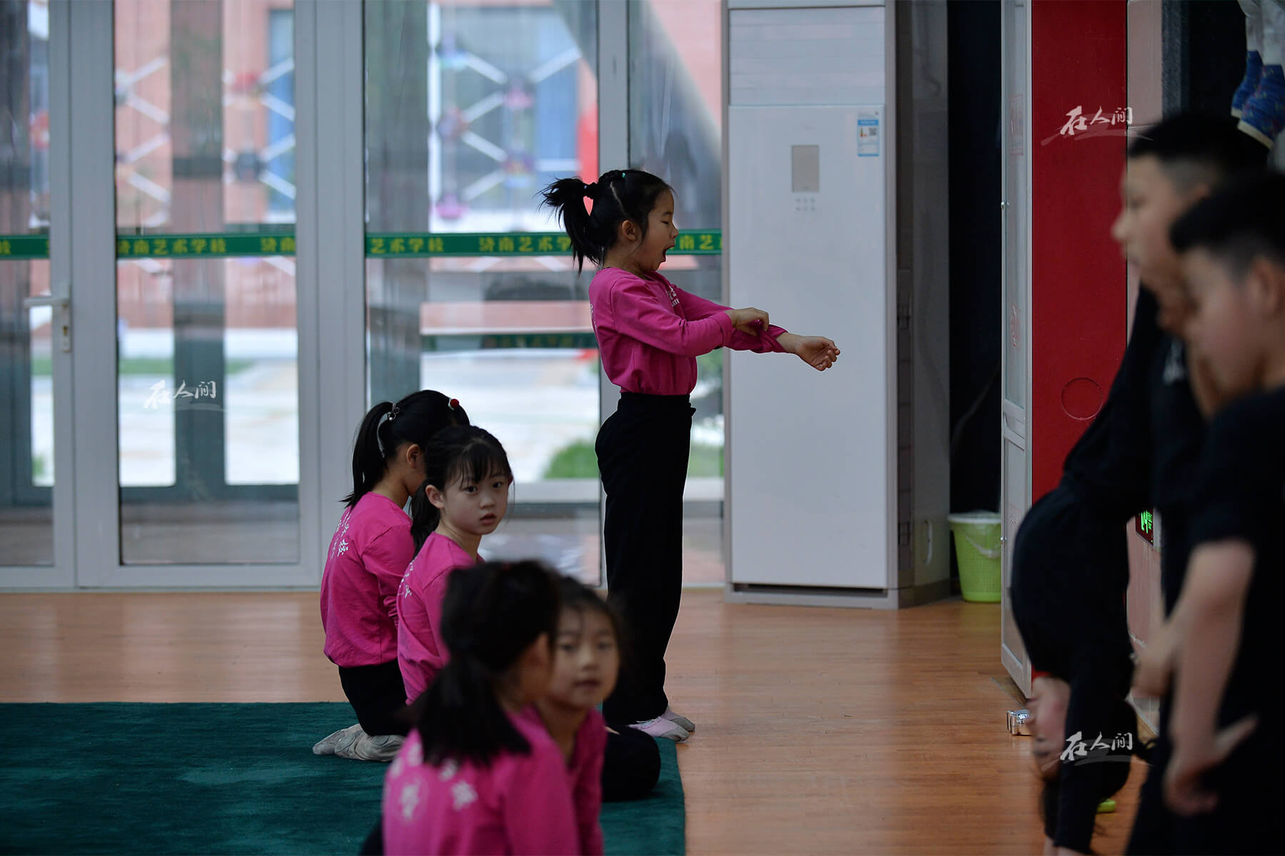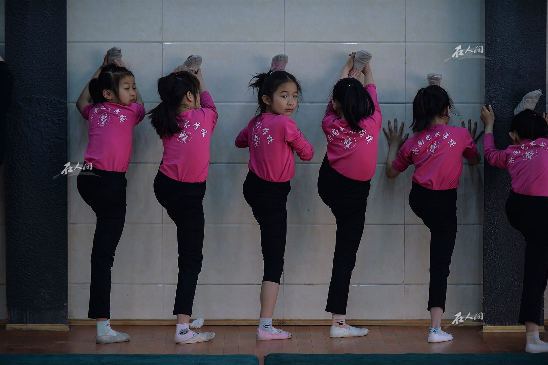济南艺术学校,曼齐(左三)在靠墙做拉伸。济南艺术学校实行寄宿制,学生们每周一到周六都要在校园内学习生活。孩子们每天早上五点半就哈欠连天地爬起来,6点钟准时开始练功。练功房里不时传出“哎呦哎呦”的叫声,但很少有孩子坚持不下来的。