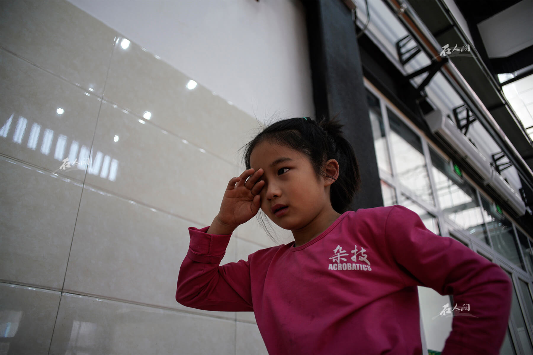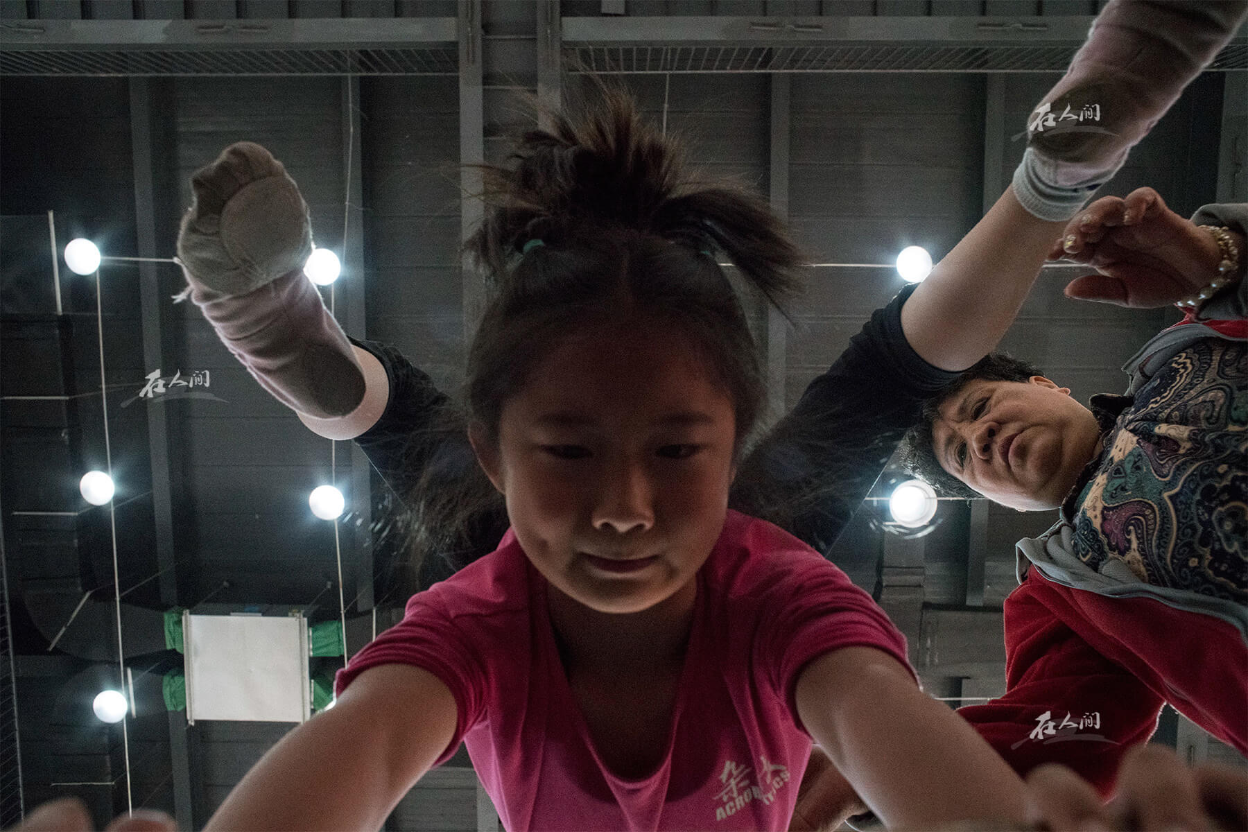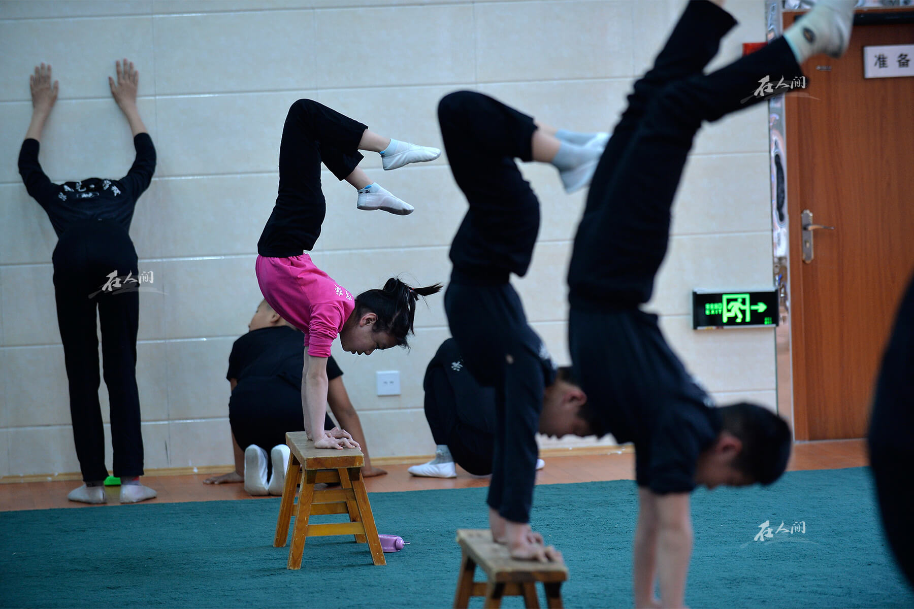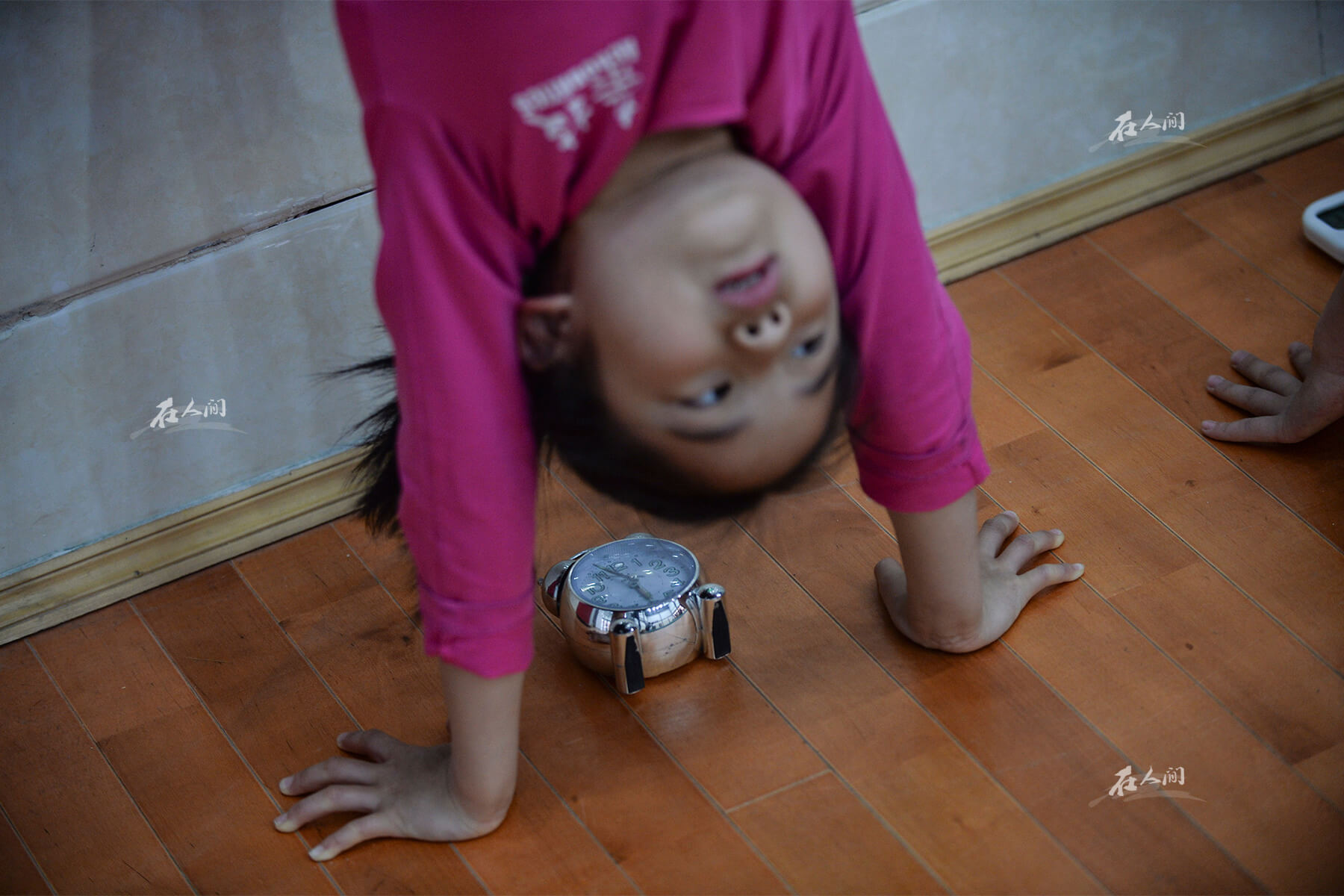 济南艺术学校,曼齐靠墙倒立,地面上放着计时器。母亲窦琼知道学杂技跟学钢管舞不同,杂技更注重基本功,可能还伴随着日复一日的枯燥练习。