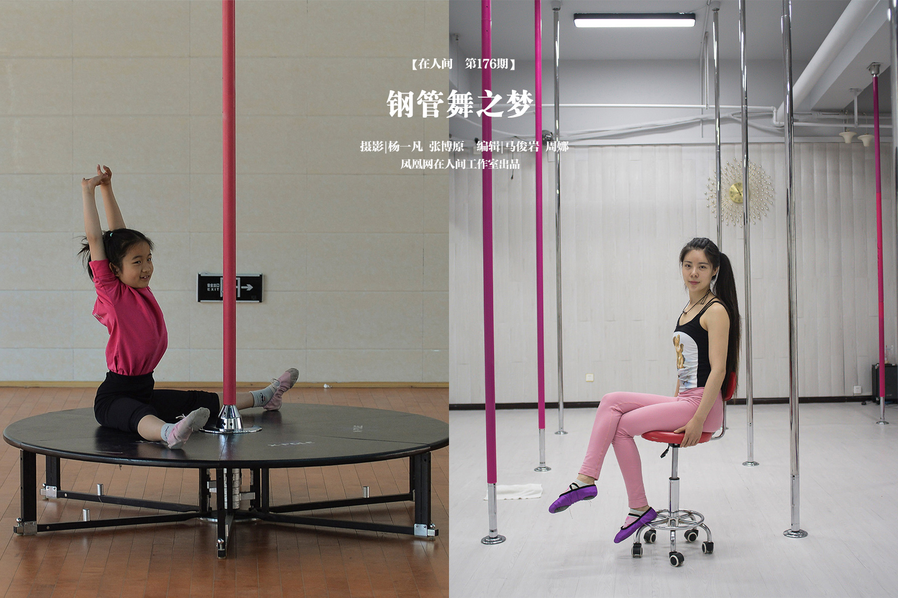 8岁的窦曼齐跳钢管舞已经两年了,每次一哭,她都这样向妈妈解释:“我哭了只是因为疼,我还想一直学”。她有过一个理想——当飞行员,现在她又改变了想法:“进钢管舞国家队,当会跳舞的飞行员”。27岁的佳佳以前是地方税务局的工作人员,一次车祸之后,她开始比以往时候都注重自己的身体健康和身材之美。她开始北漂学钢管舞,希望有一天,能让父母看到自己的表演,告诉他们,“和你想象的不一样”。