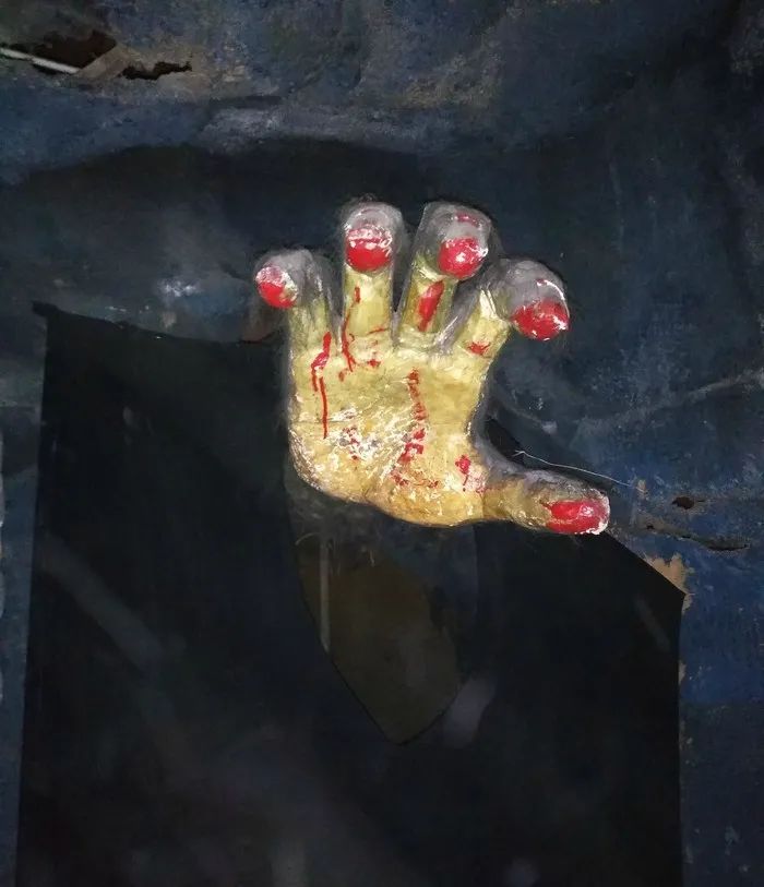 据说这只手后墙壁内有机关,在你不注意地时候可能会摸你一把。但现在已经攒满了蜘蛛网和灰尘,机关也应该损坏了。
