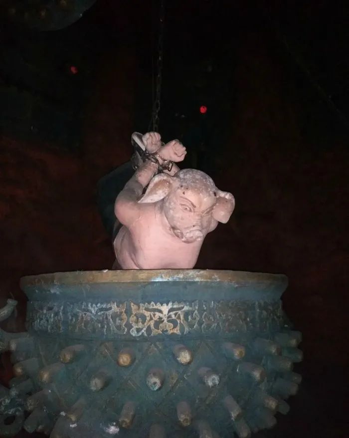 作为食材的八戒在神似水雷的大锅上被铁链以SM的经典姿势反捆,狰狞的猪头面部表情和丰满的人类身躯,让参观者深刻体会到恐怖谷效应。