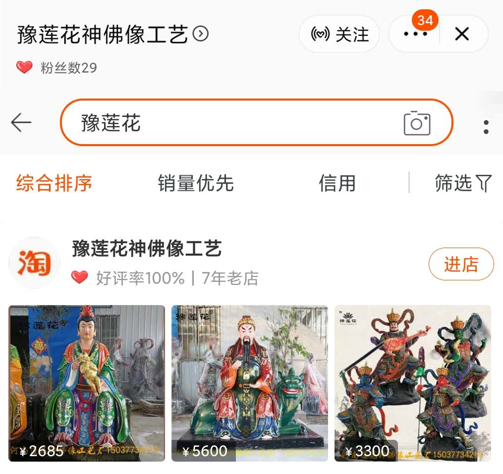 河南豫莲花佛像工艺厂专门产这种塑像,价格区间从330到12000不等。和淘宝七年老店的头衔一比较,29个粉丝着实磕碜。