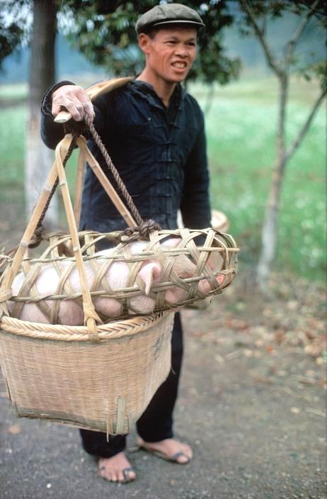 广西桂林,一位挑着猪仔的农民伯伯。那时候养猪,是中国农民的一项主要副业。当然,79年的猪可不是吃饲料长大的,猪肉味道好得很。