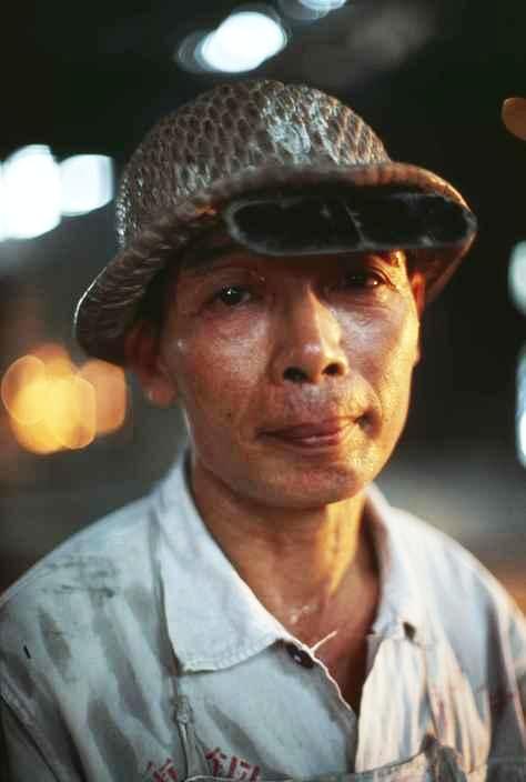 一位炼钢老工人,滚烫的铁水映红了他黝黑的脸庞。