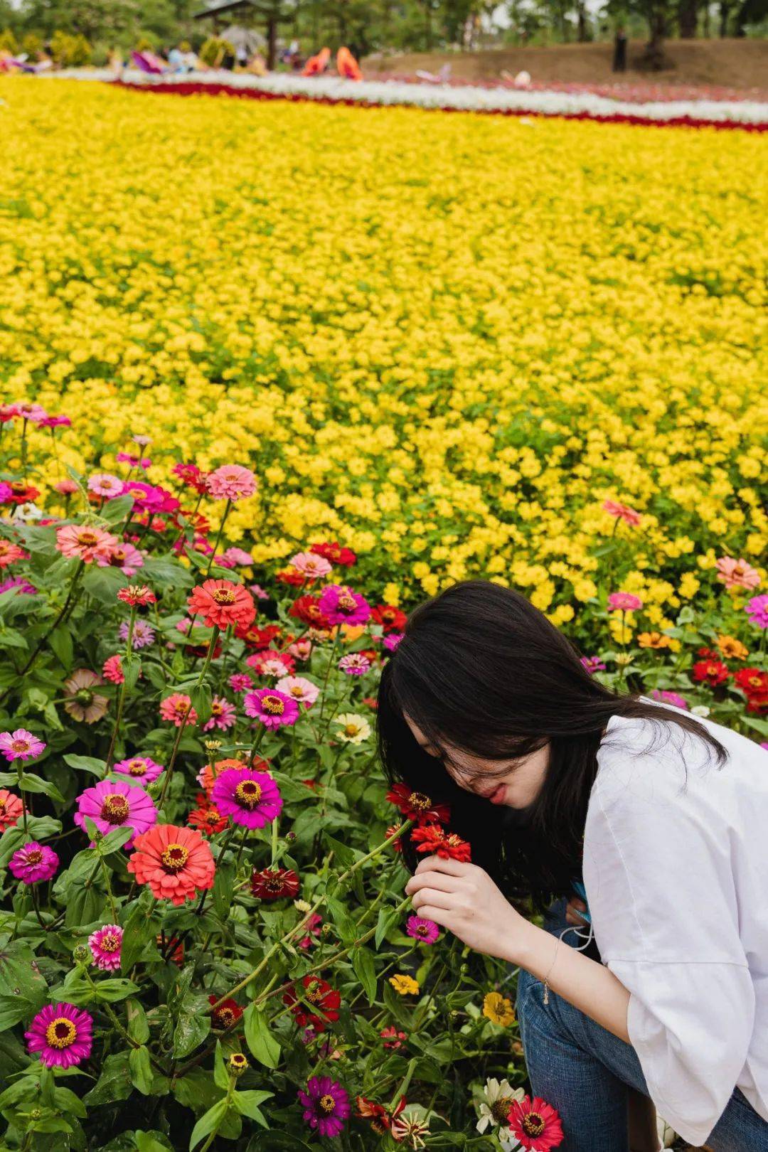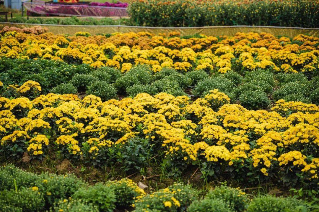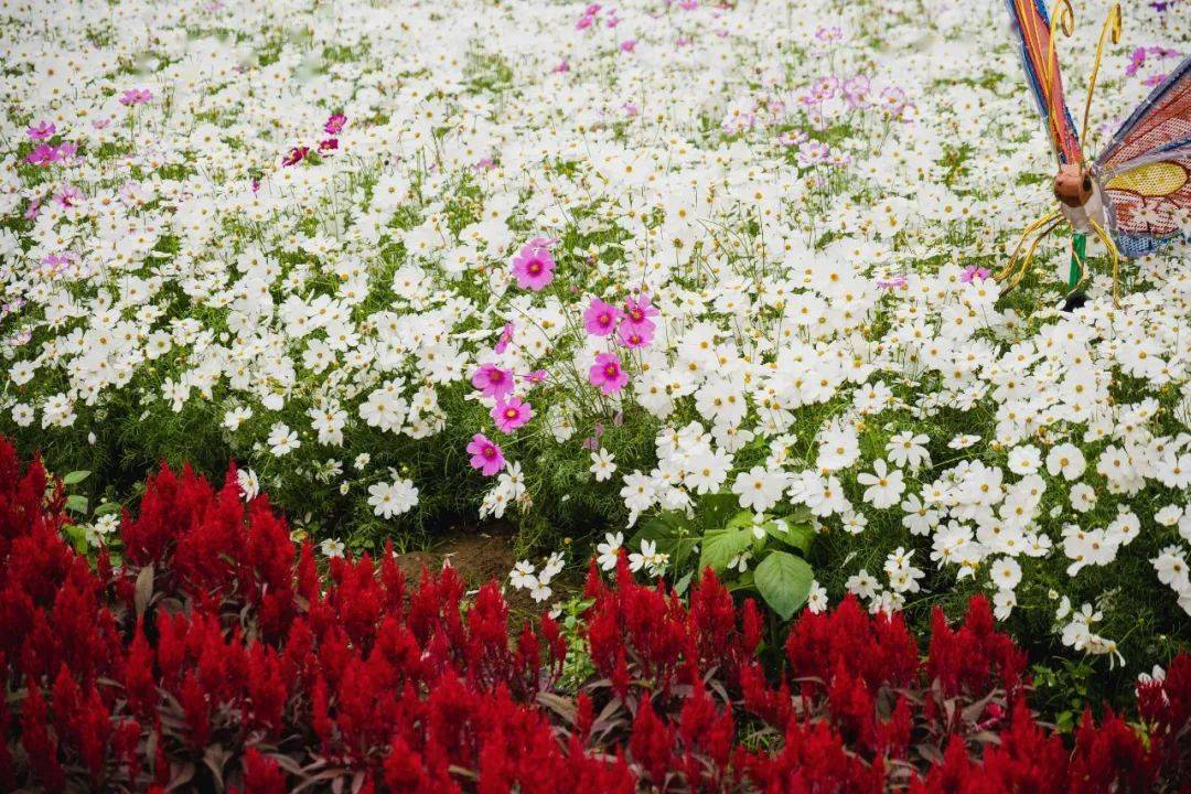 这一片主花海主要以小菊系的菊花和波斯菊组成,黄的、粉的、白的、红的……各种颜色铺彻一起,错落有致,花海里面还增设了蝴蝶、花艇和风车等饰品来点缀,美到非常有视觉冲击力!